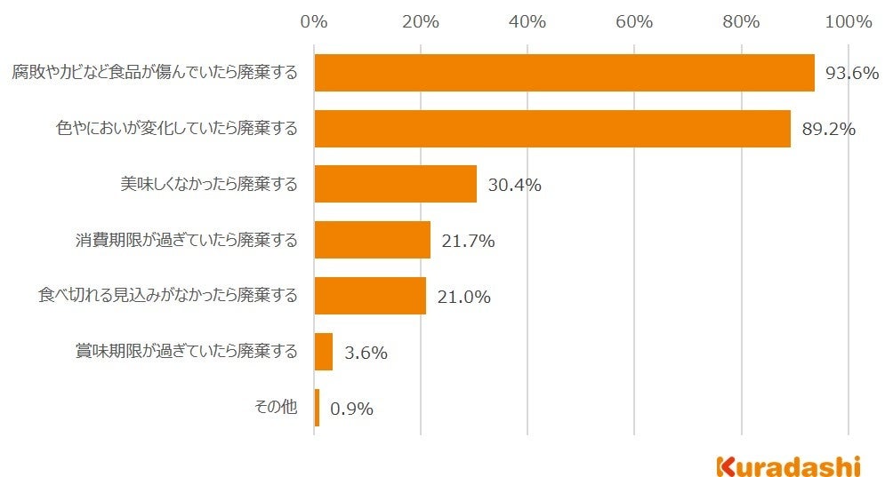 食品を廃棄する要因として最も多かった回答は「腐敗やカビなど食品が傷んでいたら廃棄する」で、次いで「色やにおいが変化していたら廃棄する」でした。「食品が安全に食べられる期限」である「消費期限」が過ぎていたら廃棄すると回答した方は21.7%、「食品が美味しく食べられる期限」である「賞味期限」が過ぎていたら廃棄すると回答した方は3.6%だったことから、賞味期限・消費期限はあくまでも目安であり、実際に食品の状態を見て廃棄するか否かを判断している人が大多数であると推察されます。