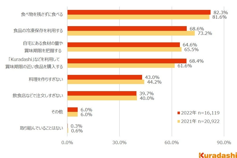 フードロス削減への取り組みとして最も多かった回答は昨年と同じく「食べ物を残さずに食べる」、次いで「食品の冷凍保存を利用する」でした。3番目に多かった回答は「『Kuradashi』などを利用して賞味期限の近い商品を購入する」で、昨年対比で6.8pt上昇しました。冷凍保存の活用や賞味期限を把握するなど「すでに手元にある食品からフードロスを発生させない」という取り組みだけではなく、「フードロスを減らすために購入先や購入するものを見直す」という、より踏み込んだ取り組みを行っている人が増えていることが分かります。