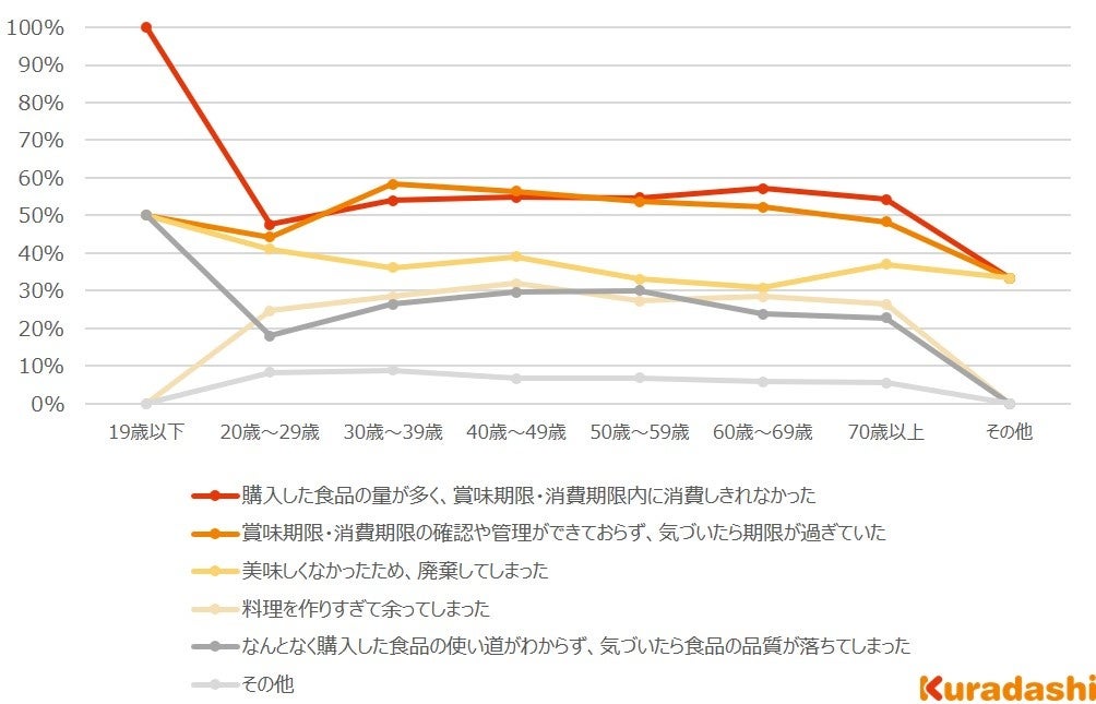 フードロスを発生させた理由として、30歳~39歳と40歳~49歳では「賞味期限・消費期限の確認や管理ができておらず、気づいたら期限が過ぎていた」が最も多く、それ以外の年代では「購入した食品の量が多く、賞味期限・消費期限内に消費しきれなかった」という回答が最も多い結果となりました。
