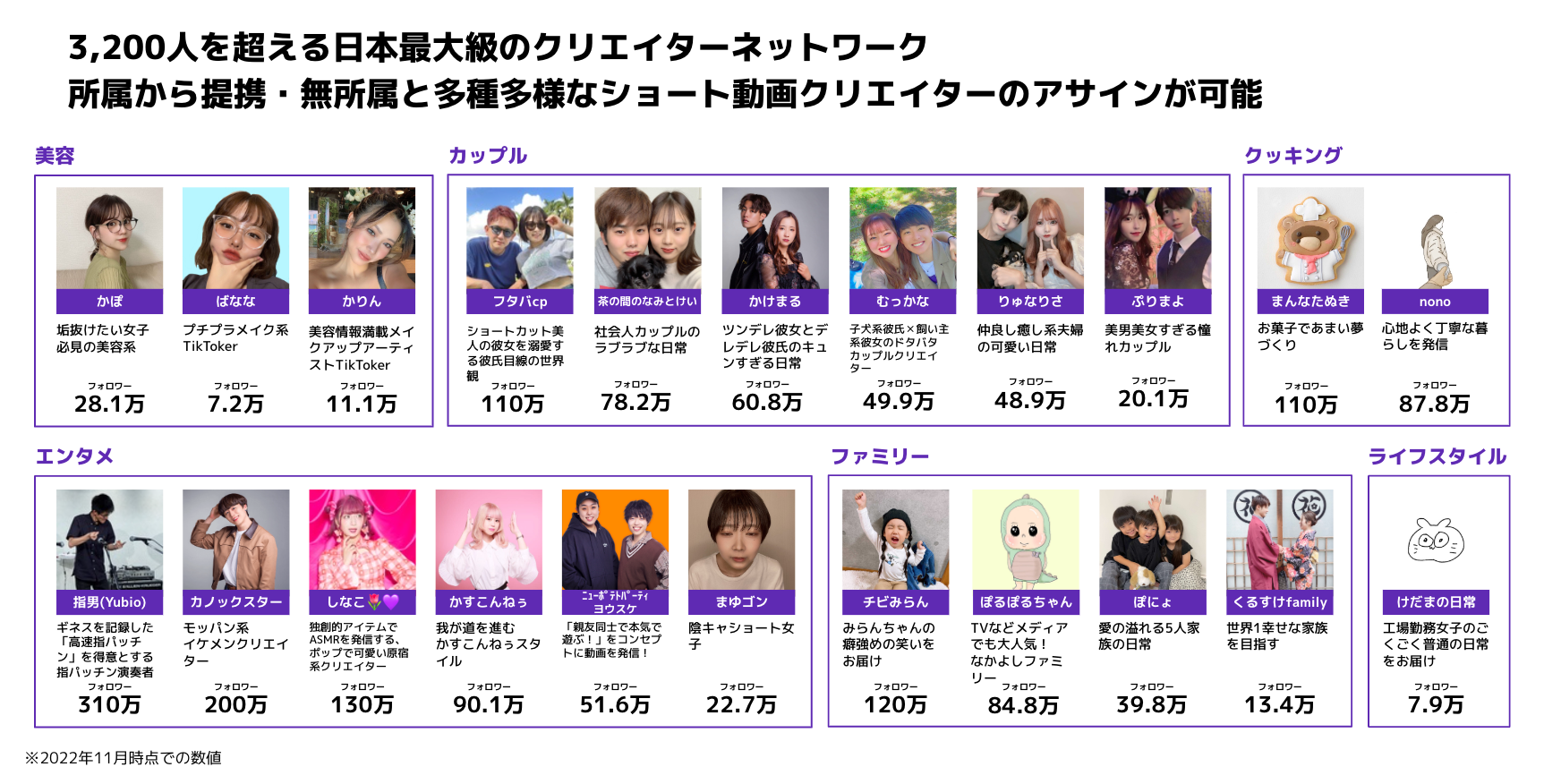 3,200人を超える日本最大級のクリエイターネットワークを持ち、BitStar所属だけでなく、提携先の企業や無所属の方まで、幅広いキャスティングが可能です。お客様のブランドを、最も魅力的に発信することのできる、最適なクリエイターを選出いたします。
