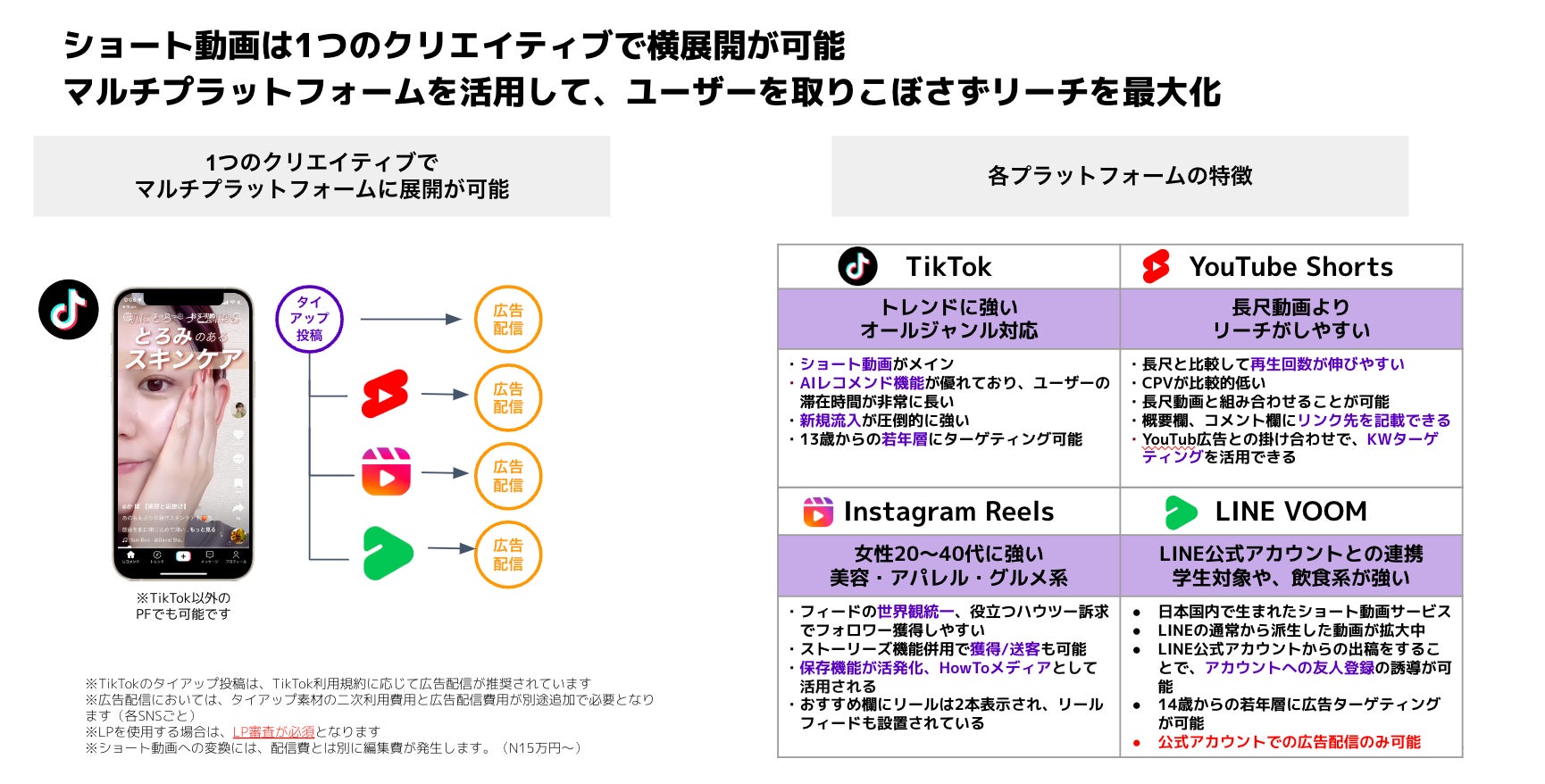 タイアップだけでなく、広告配信を組み合わせることで、インプレッション単価が抑えられ、全体のリーチ数が高まります。また、複数のプラットフォームを採用することで、プラットフォーム毎に異なるターゲットを取りこぼさずにリーチを最大化することができます。ショート動画の特性上、1つのクリエイティブで様々なプラットフォームへ展開することが可能です。