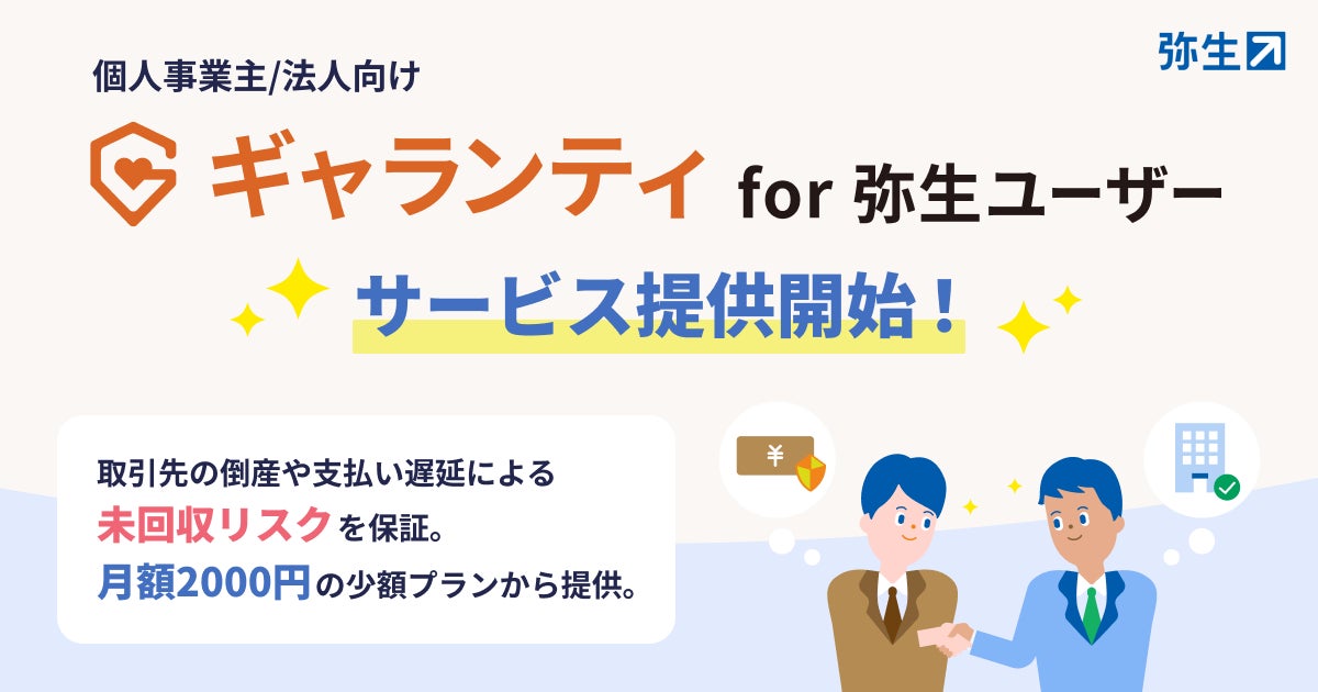 弥生株式会社(本社:東京都千代田区、代表取締役 社長執行役員 兼 CEO:武藤健一郎、以下「弥生」)は、法人間取引における売掛金未回収リスクを軽減するための保証サービス「ギャランティ for 弥生ユーザー」の提供を開始しました。本サービスは、2025年7月に弥生グループにジョインしたアラームボックス株式会社(本社:東京都新宿区、代表取締役社長:武田浩和、以下「アラームボックス」)の提供するサービスを、弥生ユーザー向けに提供するものです。