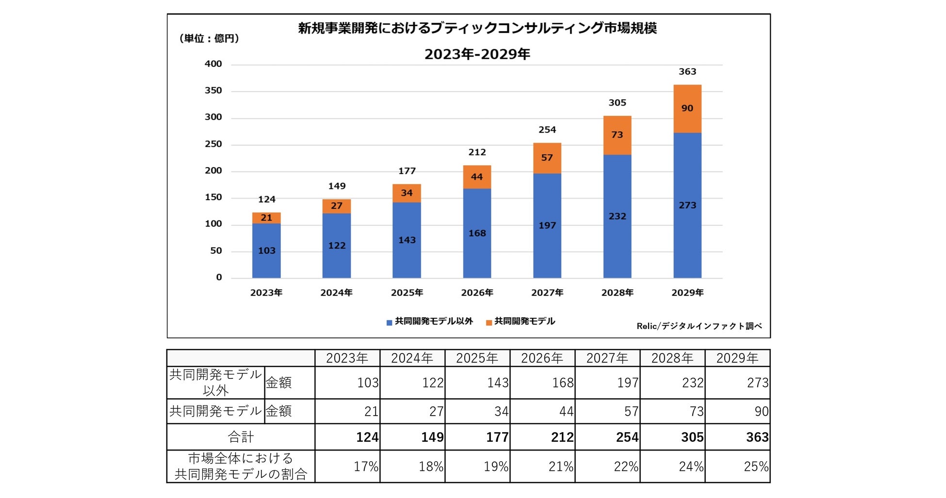 ・2029年の新規事業開発におけるブティックコンサルティング市場は2024年比約2.4倍の363億円に達すると予測