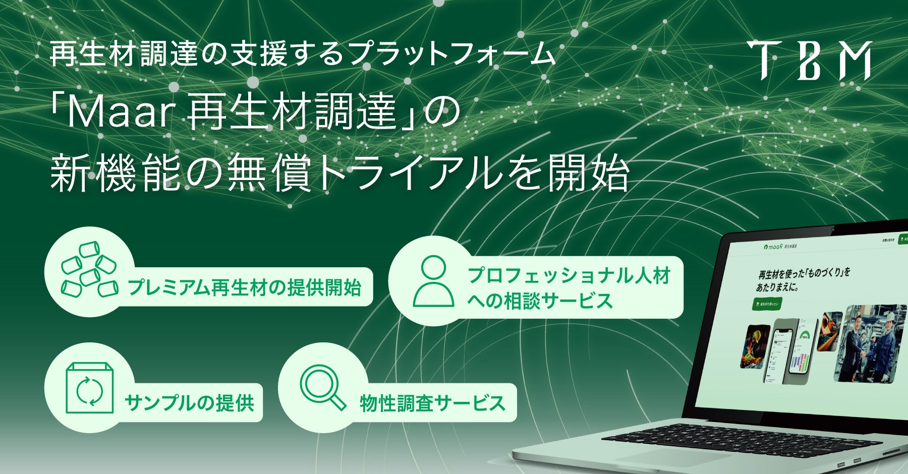 株式会社TBM(本社:東京都千代田区、代表取締役CEO:山﨑敦義、以下TBM)は、トレーサビリティ情報等を付与した再生材や再生原料(以下、再生材等)の調達を支援するプラットフォーム「Maar 再生材調達」(以下、本サービス)において、再生材の流通促進に向けたニーズの検証を目的に、新機能の無償トライアルを開始します。