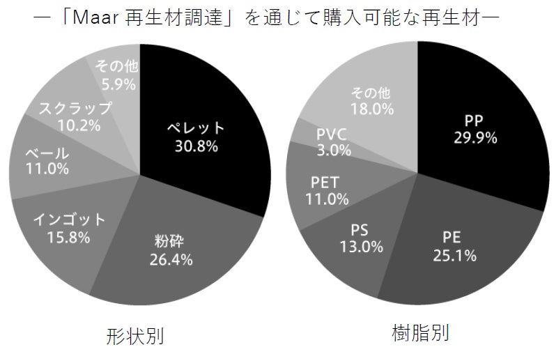 「Maar再生材調達」には、製品・成形メーカー等の「再生材等を利用して製品を製造する企業」と、廃プラスチック排出企業・リサイクラー・コンパウンダー等の「再生材等を販売する企業」が、本サービス内で売買したい再生材の要求事項データが多数登録されています。現在、本サービスは、年間約25万トンの販売ポテンシャル*を有しており、多種多様な再生材がラインナップされています。