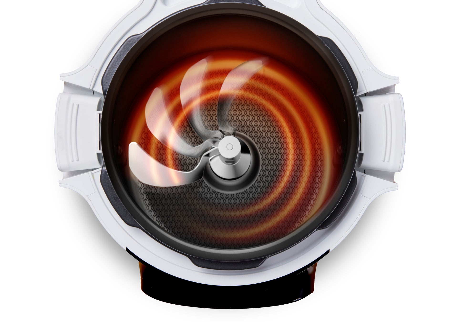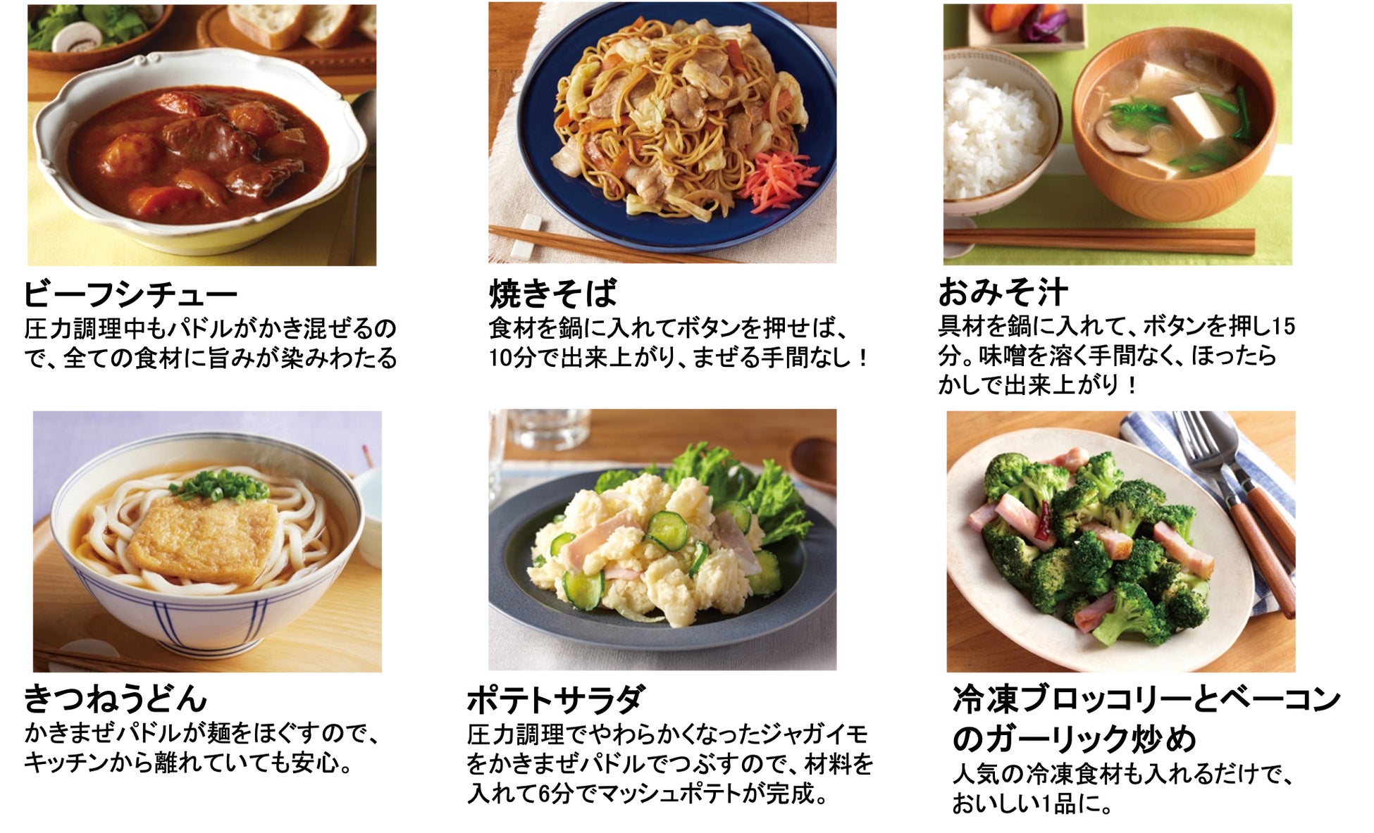 かきまぜパドルで、幅広い料理をおまかせ調理。圧力調理中もかき混ぜることができるので、煮込み料理はさらにおいしく、ポテトサラダは加熱からつぶすまで6分でできます。