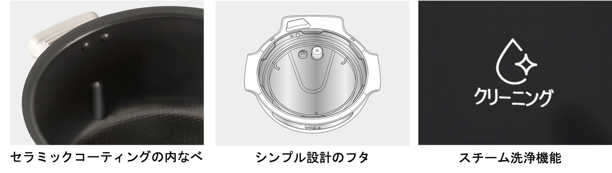 内なべにも取っ手が付いており、料理の取り分けやお手入れの際の持ち運びも安心。内なべはセラミックコーティングでこびりつきにくく、フタの設計もシンプルでパーツが少ないのでお手入れしやすいのも嬉しいポイントです。鍋に付いた料理のにおいを除去できる「スチーム洗浄機能」も搭載しています。
