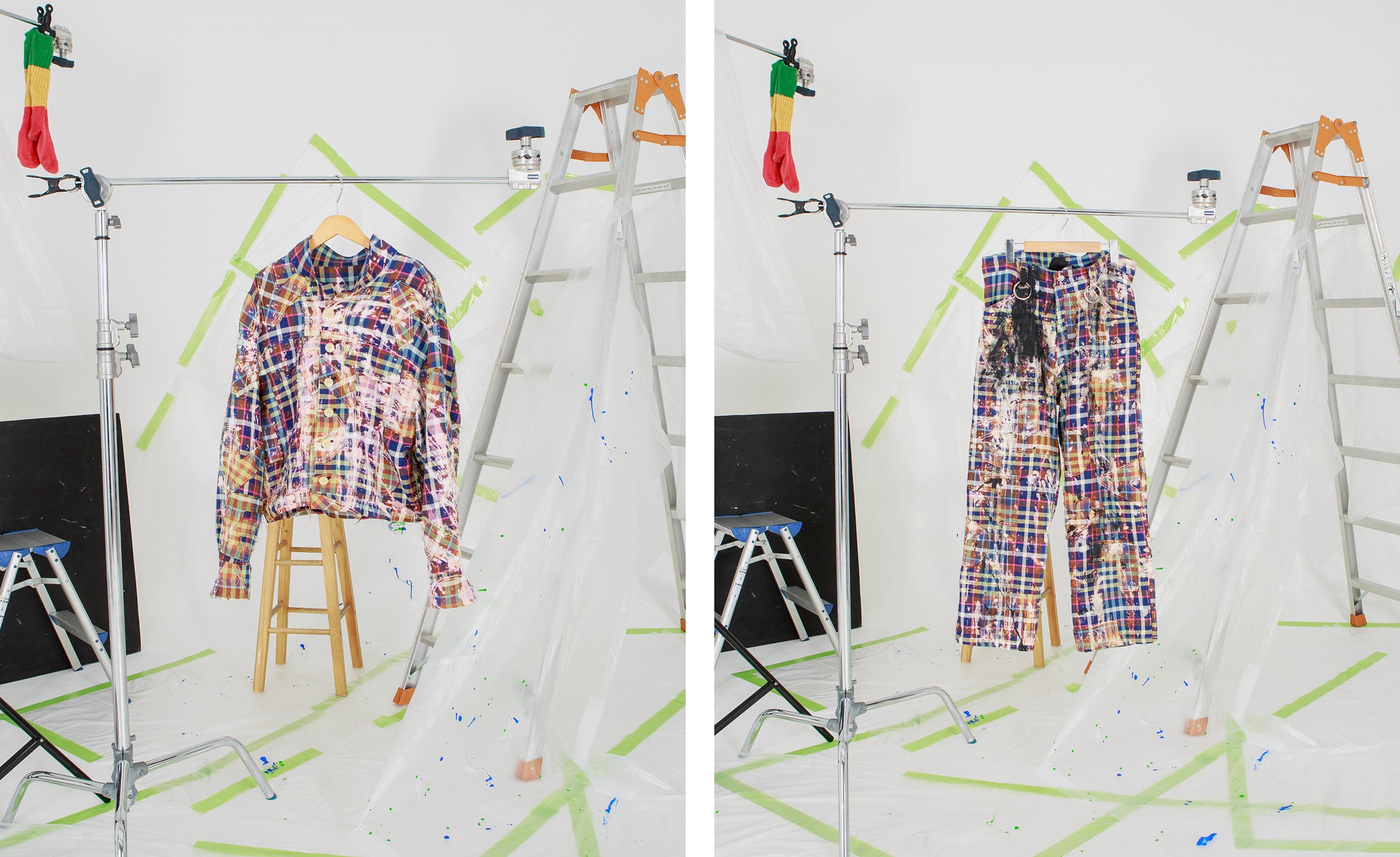 ビビッドなチェックにLOVEの4文字のアップリケ、ピンクに抜けたブリーチや黒い塗装はハンドペイント仕様です。