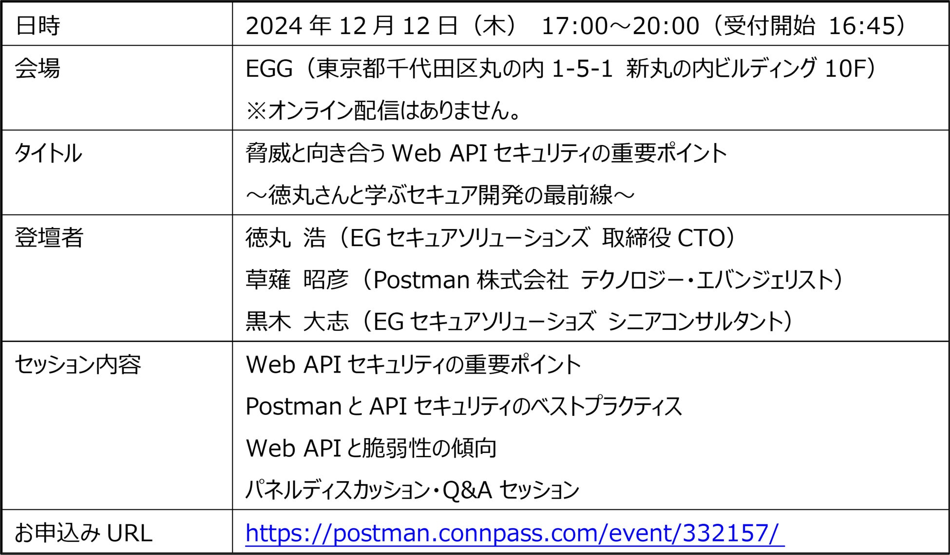 イー・ガーディアン株式会社(https://www.e-guardian.co.jp/ 東京都港区 代表取締役社長:高谷 康久 以下、「イー・ガーディアン」)のグループ会社であるEGセキュアソリューションズ株式会社(https://www.eg-secure.co.jp/ 東京都港区 代表取締役:高谷 康久 以下、「EGセキュアソリューションズ」)は、API開発をリードするPostman株式会社(東京都千代田区 代表取締役社長:平林 良昭 以下、「Postman」)と共催で、Web APIセキュリティをテーマにしたセミナーを2024年12月12日(木)に開催いたします。