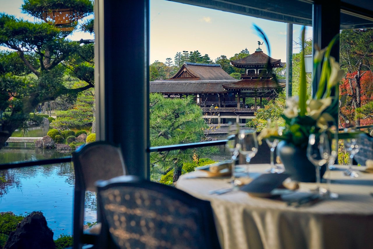 その一つである平安神宮会館は、明治28年の平安遷都1100年を期に桓武天皇をご祭神として創建された平安神宮の境内に建つ、優雅で気品のある建物です。四季折々の風情を感じる約1万坪を誇る広大な国指定名勝「神苑」を借景に、京都の旬の食材を使ったコース料理を味わっていただける唯一無二の体験を提供しています。