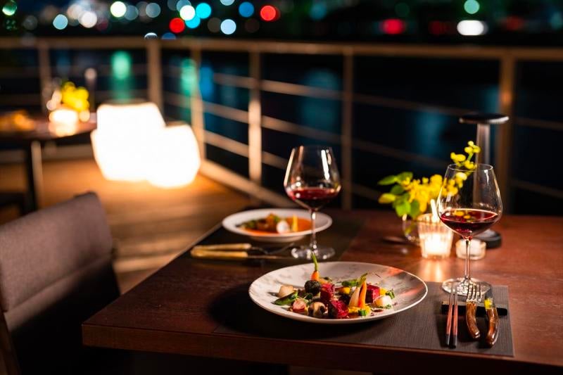 「了以棟」に設けられた川床レストランは、 鴨川沿いに半年間だけ現れるご予約専用の幻のレストランです。全国のVMGレストランを監修するグランシェフの石井が腕をふるい、ご宿泊者様だけのために考案された京都の旬の食材を使用した全10品の贅沢フルコースをご提供いたします。