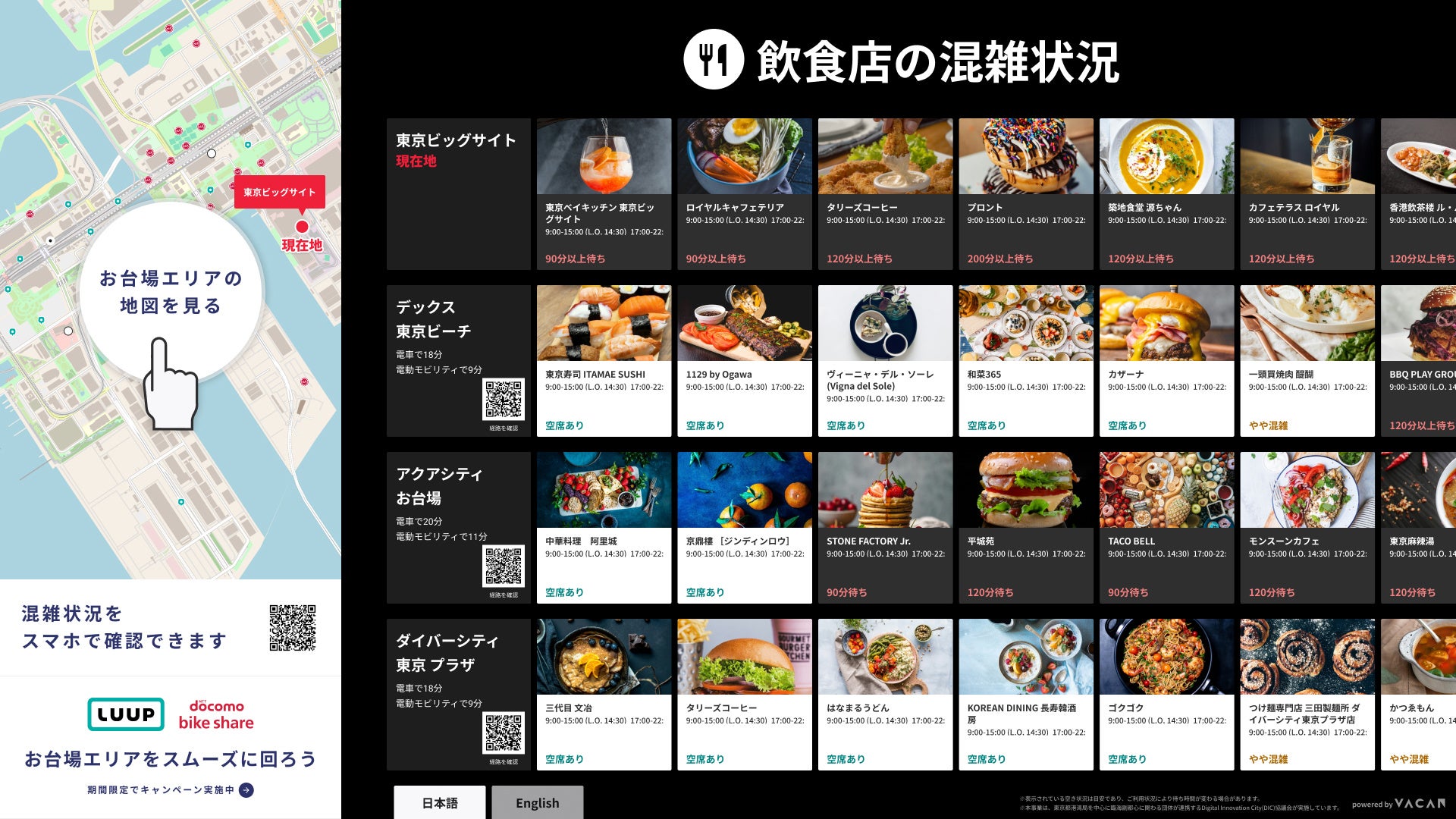 今回の取り組みでは、混雑情報配信プラットフォーム「VACAN」から得られた臨海副都心エリア内の飲食店等の混雑情報を表示するデジタルサイネージを東京ビッグサイトと国際展示場駅に設置します。混雑情報は、 AIカメラ・デジタル整理券・IoTボタン等のデバイスを用いて発信しています。