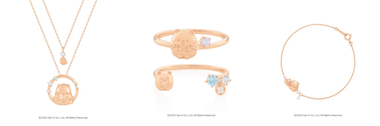 第2弾となる今回登場するのは、しろくまが里帰りする「しろくまのふるさと」のお話に着想を得た、しろくまやしろくまの家族がモチーフのジュエリー。家族の温かさを感じる愛らしいエピソードを想わせるデザインに、心が癒されるコレクションです。しろくまと一緒にしろくまのふるさとに向かうすみっコたちも、冬らしくおめかしをして登場。