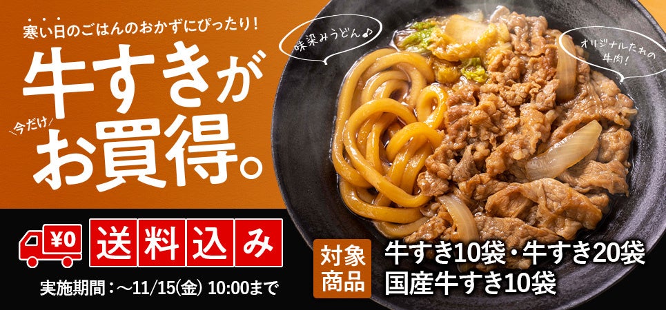 株式会社吉野家(本社:東京都中央区 代表取締役社長 河村泰貴、以下吉野家)は、「吉野家公式通販ショップ」他ECモール店舗で、全国の吉野家店舗(※1)で「牛すき鍋膳」の販売を開始した本日から11月15日(金)10時まで「冷凍牛すき」(※2)など鍋商品を最大20%オフ、送料込みで販売します。