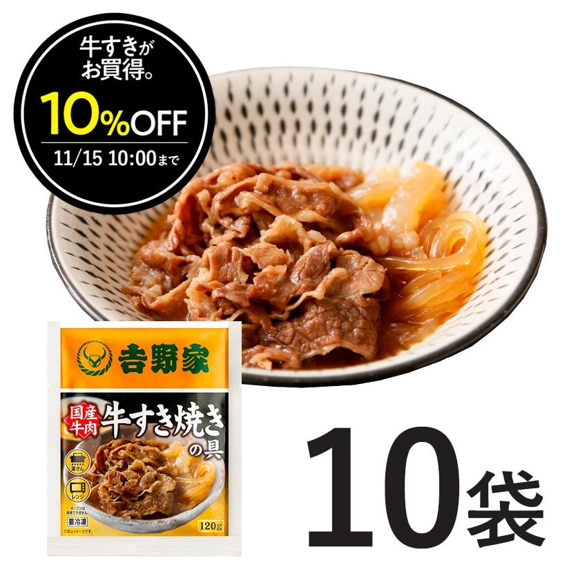 【10%OFF】「冷凍国産牛すき焼き10袋セット」5,940円 → 5,346円 ※送料込み https://e-shop.yoshinoya.com/shop/g/g666683/