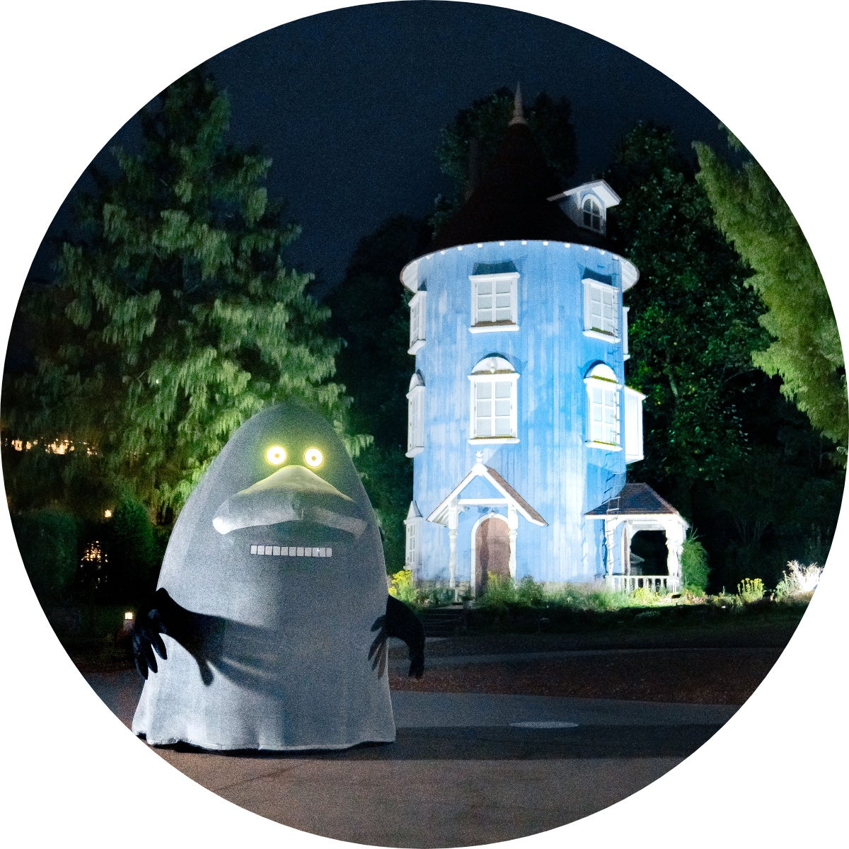 降り注ぐ雪の演出とブルーを基調としたライトアップが冬の夜をさらに引き立て、ムーミン谷での特別なひとときを鮮やかに演出します。