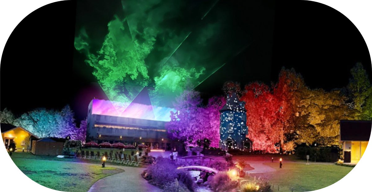 パークを色とりどりの輝きで彩るライトアップと夜空に広がるオーロラの競演。