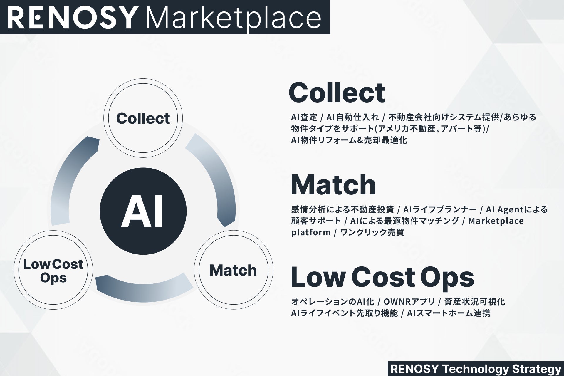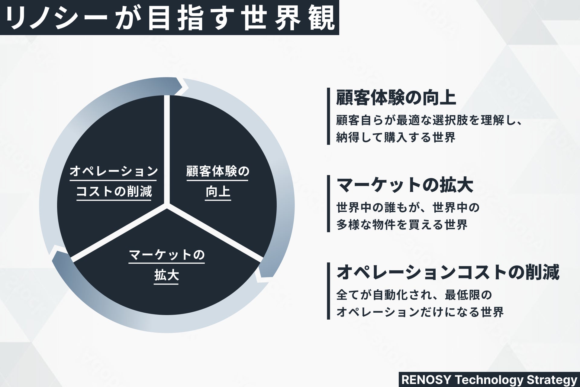 このたび、RENOSYのテクノロジー戦略強化を担う執行役員を中心に「テクノロジー戦略」を策定。この中で「AIをあらゆる場面に活用することで、イノベーションが加速され、RENOSYのさらなる成長が可能となり、それと同時に顧客体験において新たな価値創造を図りながら、コスト削減を推進し、生産性の向上を図る」ことを示しました。