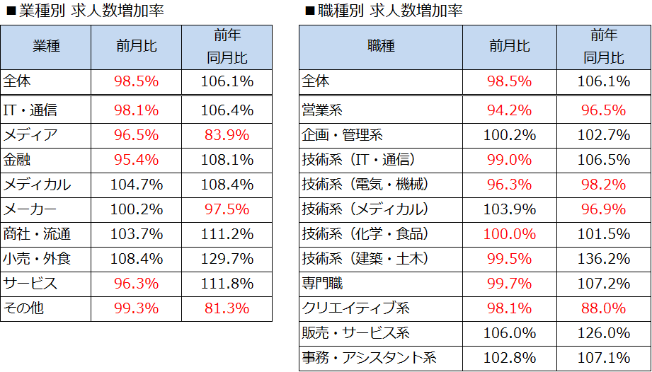 業種別では、「その他」を除く8業種のうち「メディカル」「メーカー」「商社・流通」「小売・外食」の4業種で求人数が増加しました。求人の増加率が特に高かったのは、「小売・外食」(前月比108.4%)、「メディカル」(前月比104.7%)でした。職種別では、11職種のうち「企画・管理系」「技術系(メディカル)」「販売・サービス系」「事務・アシスタント系」の4職種で求人数が増加しました。求人の増加率が特に高かったのは、「販売・サービス系」(前月比106.0%)、「技術系(メディカル)」(前月比103.9%)でした。
