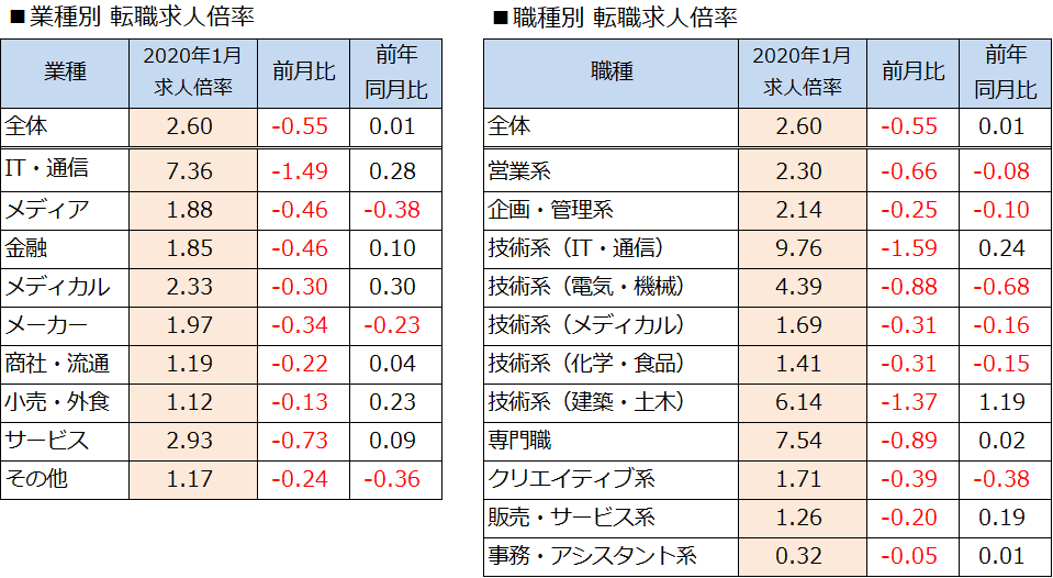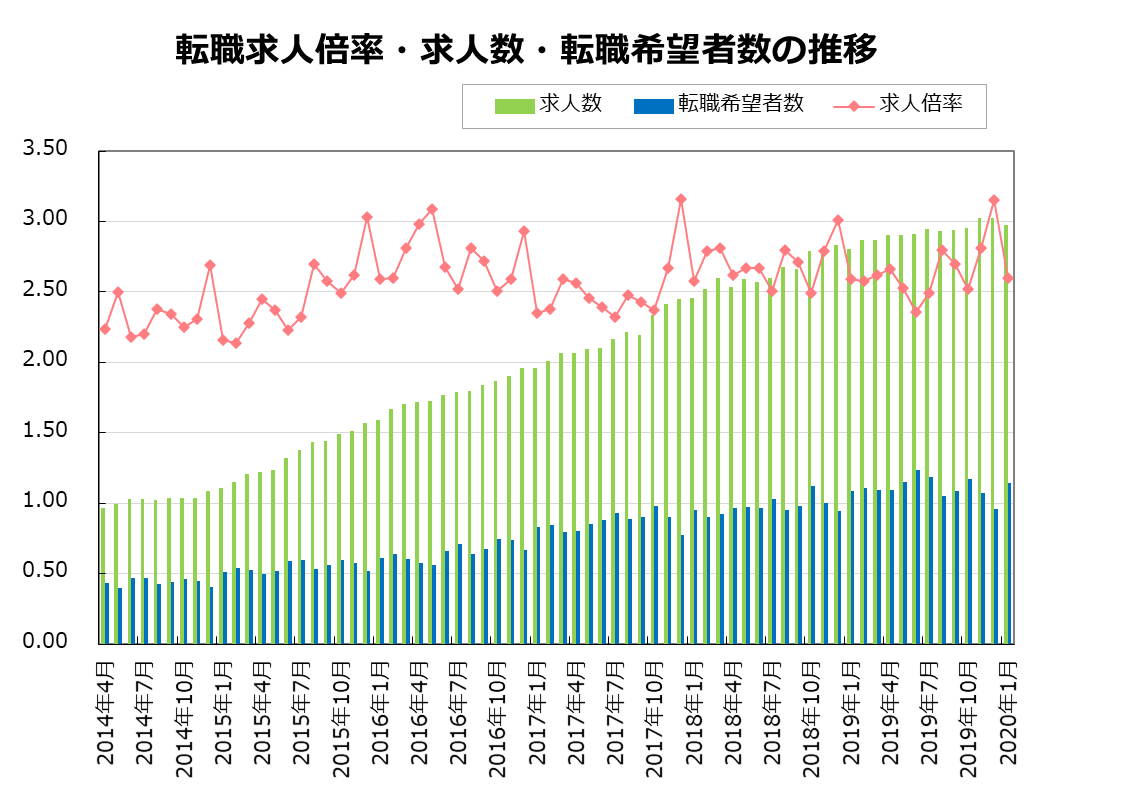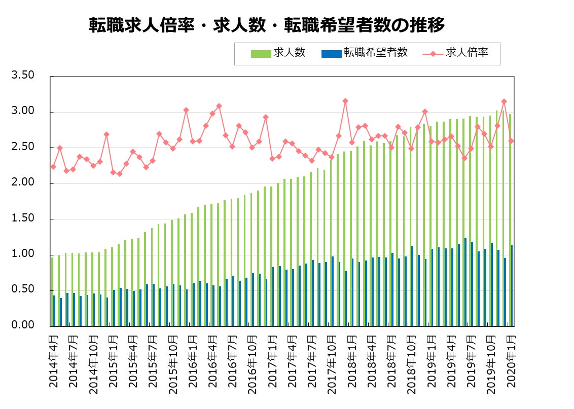 2020年1月の転職求人倍率は、前月比-0.55ポイントの2.60倍となりました。求人数は前月比98.5%、前年同月比106.1%となりました。転職希望者数は前月比119.3%、前年同月比105.7%でした。