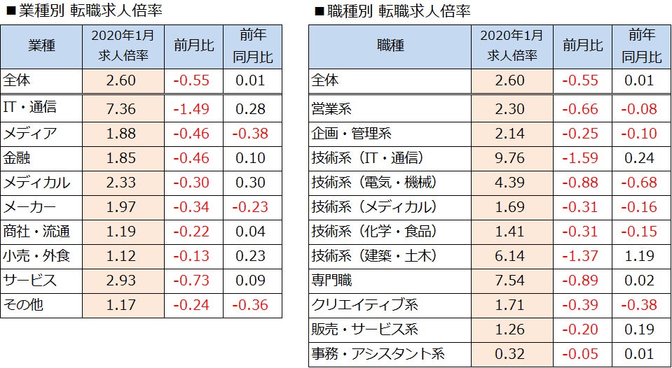 転職サービス「doda(デューダ)」 2020年1月 転職求人倍率 2.60倍(前月比-0.55ポイント)