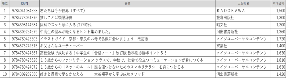 その他、読み物以外では「日本史」や修学旅行、受験勉強など、中学校での学習に役立つ図書が多数選ばれています。ファシリテーションやネットなど、コミュニケーションスキルに関わるテーマも好調です。