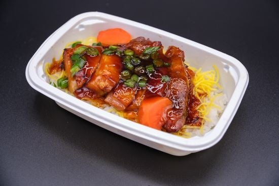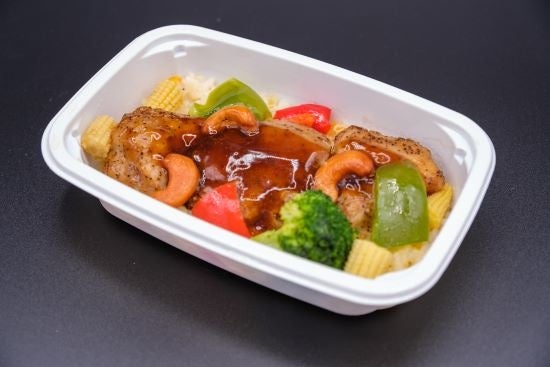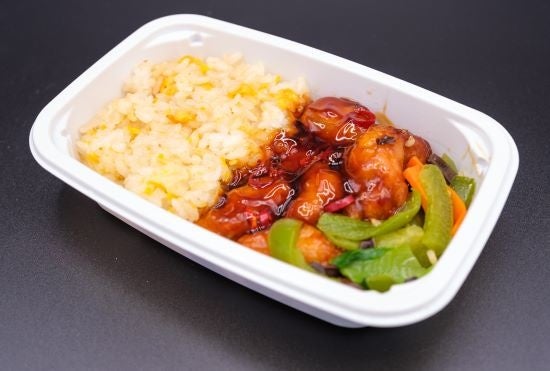 機内食独自の調理法で柔らかくした豚肉を黒酢餡で絡めました。唐辛子がアクセントとして効いています。