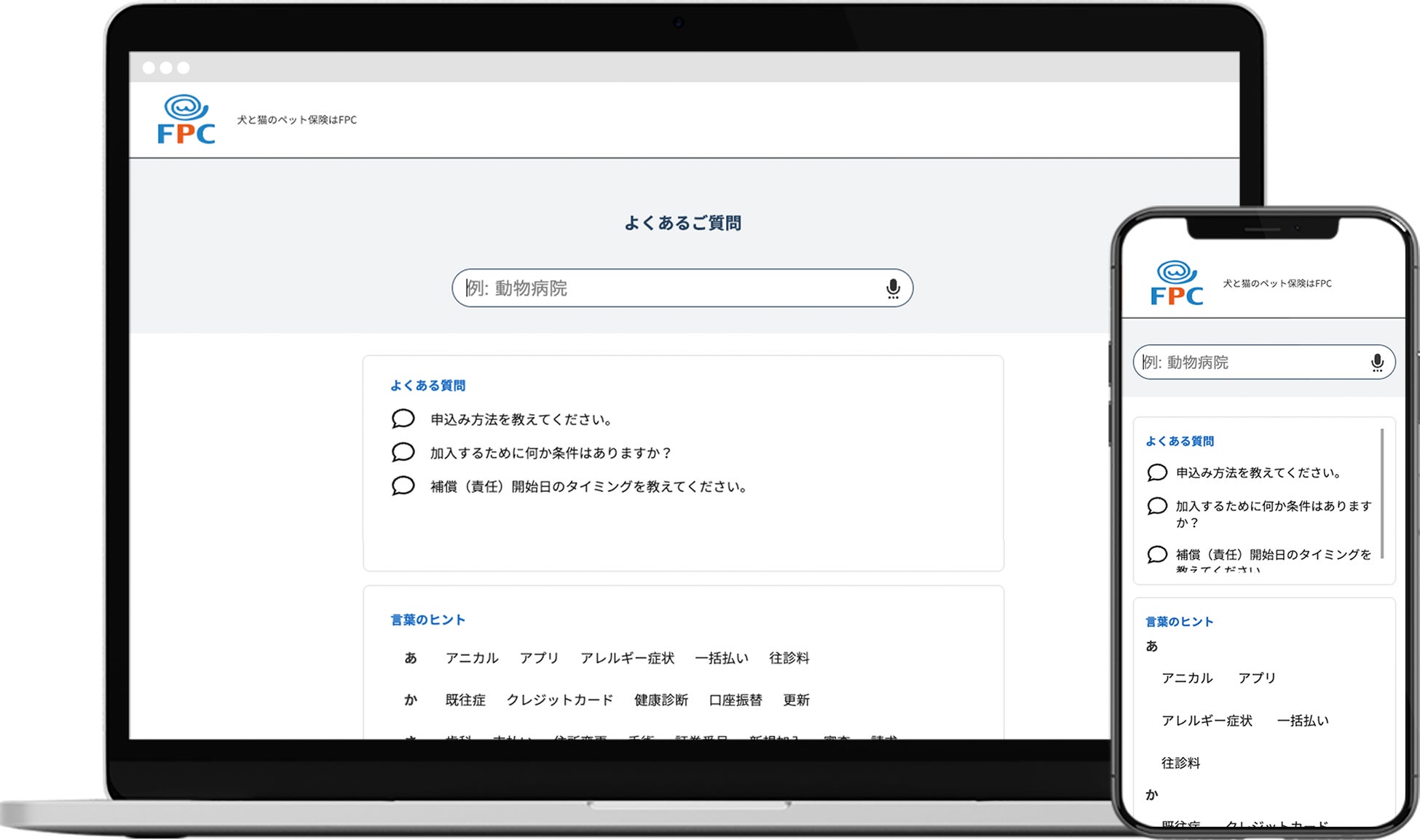 ペット保険サービスを提供するFPC社は、継続率96.15%と保険契約者さまから高い支持を得ています(※)。この度、FPC社のWebサイトのさらなる利便性向上を目的に、検索型AI-FAQ「Helpfeel」を導入いただきました。