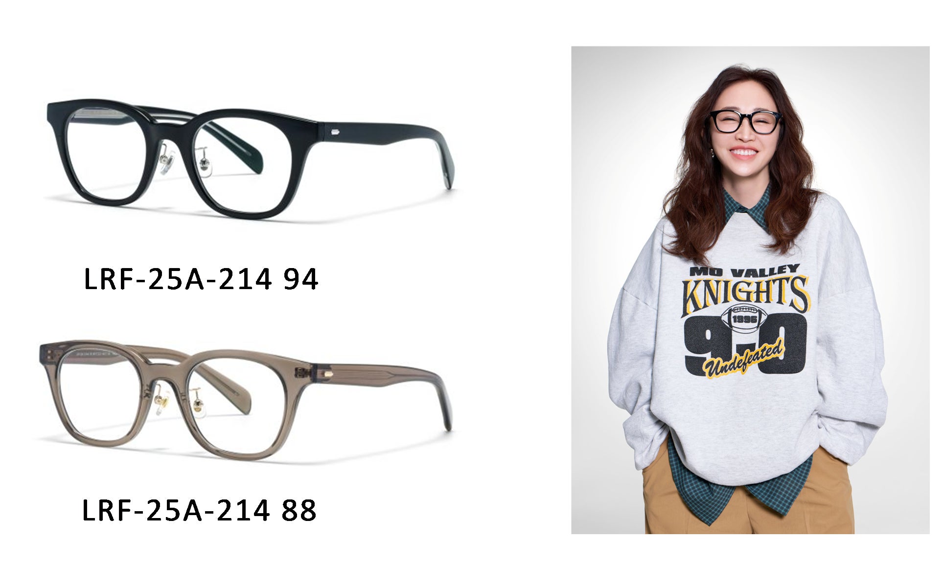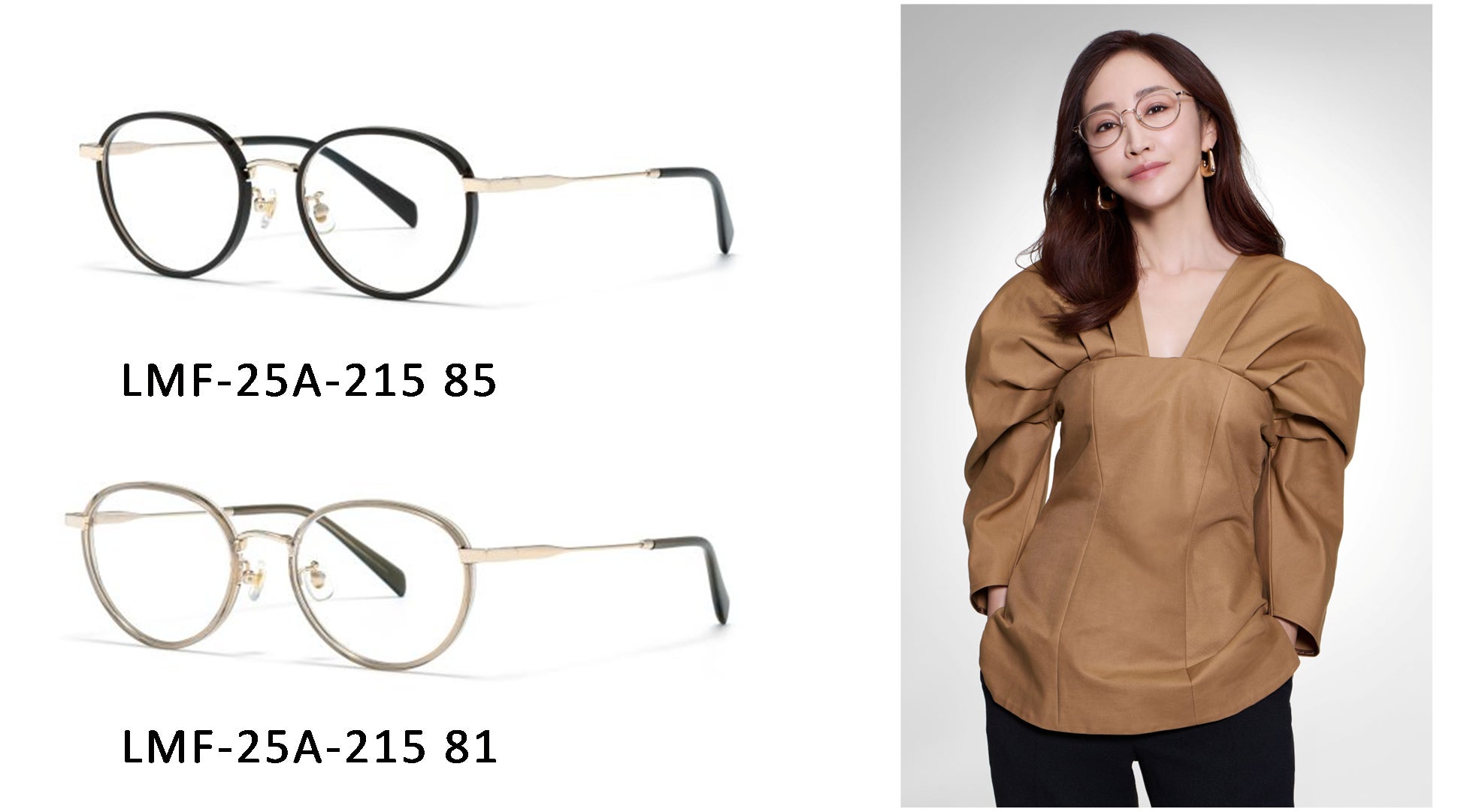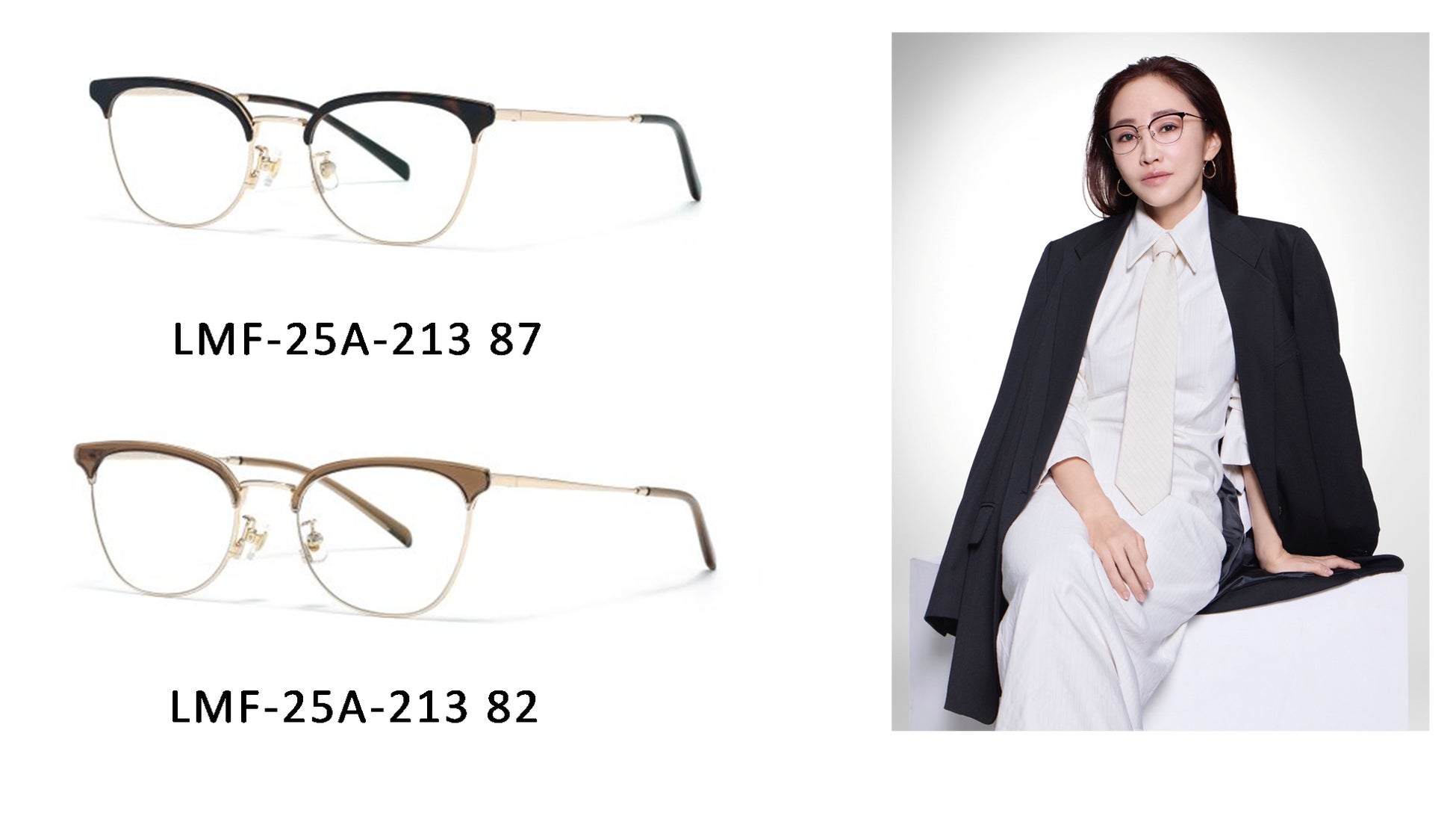 上部の太いラインが目と眉の距離を狭めて見せ、印象的なまなざしへと導くサーモントフレーム。
