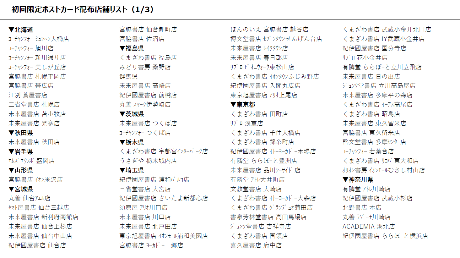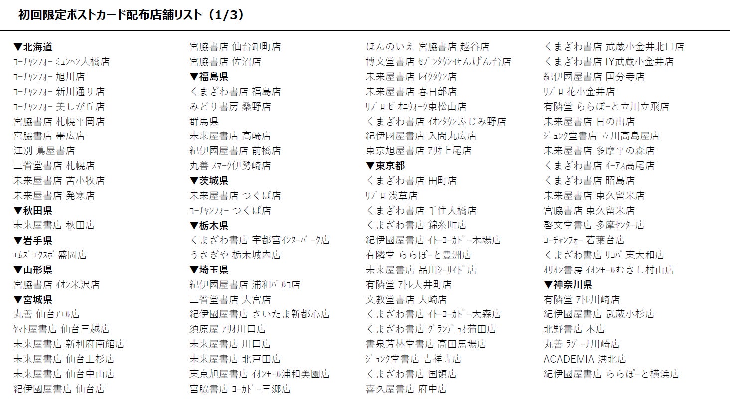 全国の一部書店での購入特典として、特製ポストカードが付いてきます。ここでしか手に入らない限定特典ですので、対象店舗をご覧のうえ、ぜひゲットしてください。