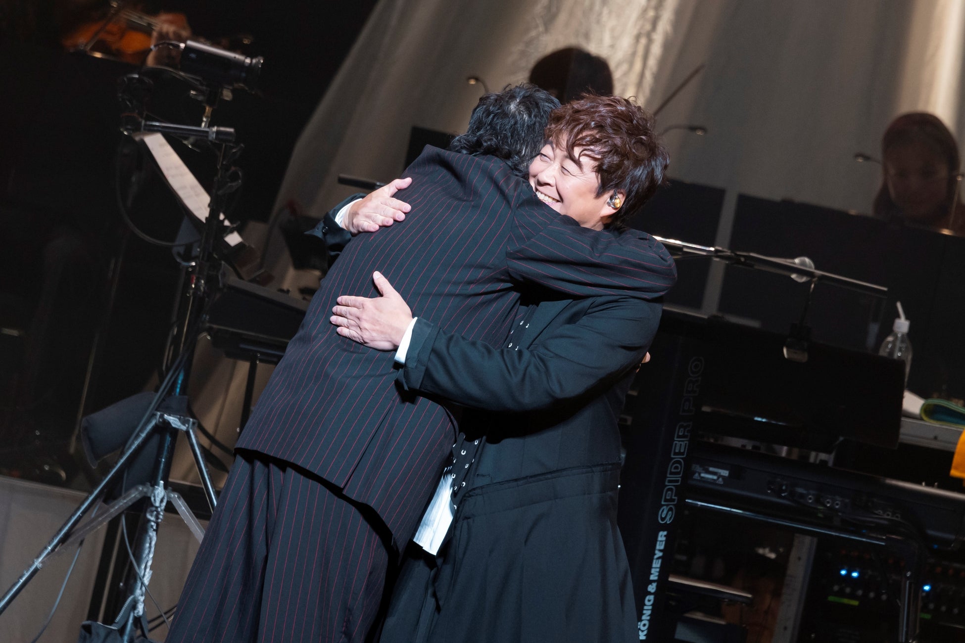 「大阪から出てきた二人にとってこの曲を演奏するのは特別なものがあると思う」と披露したのは「遠く遠く」だ。一緒に口ずさんでいる人も多い。「どんなときも。」は切なさが広がるがコール&レスポンスで一体となる。そして当時本間の失恋話を聞いた槇原が「歌でも作って元気になってもらおうと書きました。本間昭光の生き血が流れている(笑)」と語った「もう恋なんてしない」を紹介すると、本間がキーボードで即興でおどろおどろしい音を一瞬鳴らし、イントロへ。色々なストーリーが重なる濃密な時間、セッションを終えた二人はハグして、大きな拍手が贈られ、本間は槇原に手を引かれ客席に挨拶し、本編が終了。
