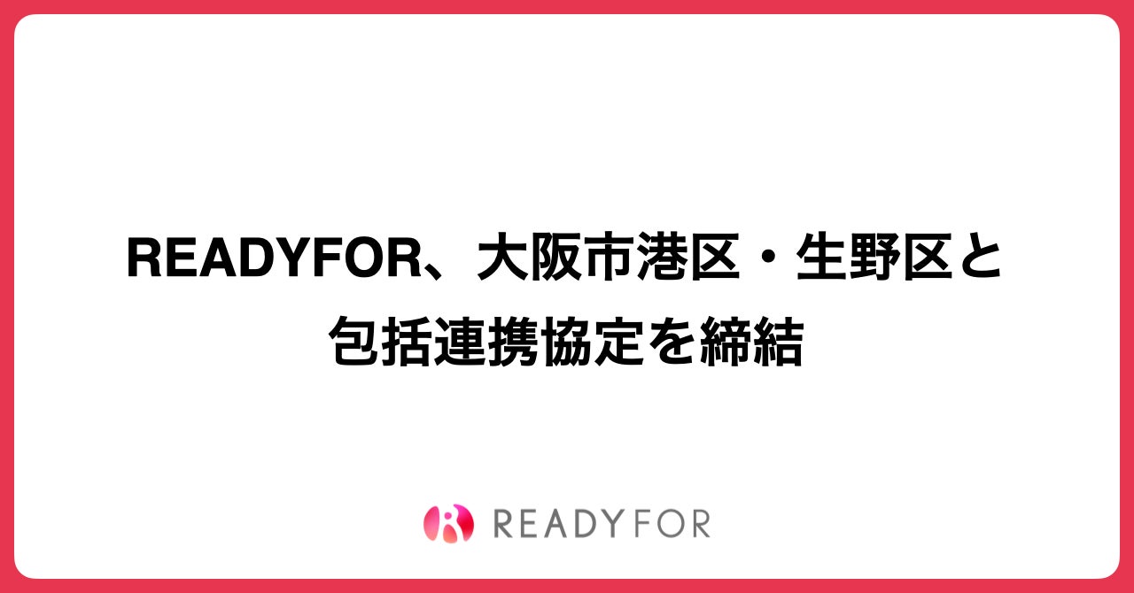 READYFOR株式会社(所在地:東京都千代田区、代表:米良はるか、以下:当社)は、大阪市港区(区長:山口照美)および生野区(区長:筋原章博)と包括連携協定を締結いたしました。