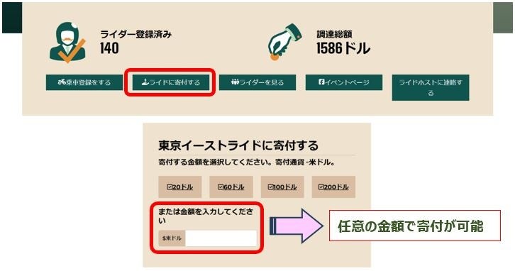 ※自分が応援する、好きな開催地のライドに対して寄付が可能です(こちらは実際に当日会場へ足を運ぶ方はもちろん、寄付のみの応援も可能となります)