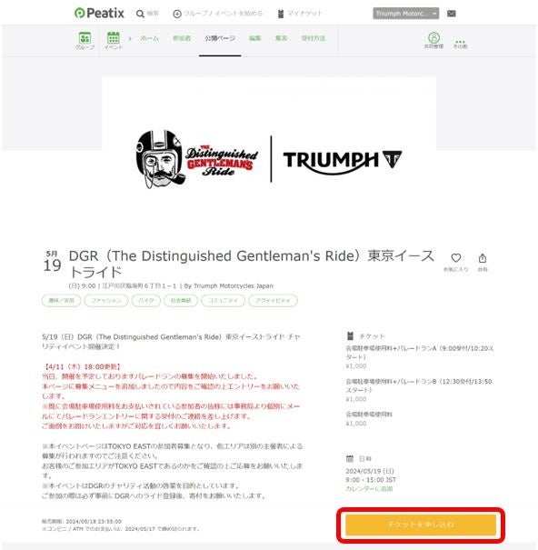 9:5/19の東京イーストライドに実際に参加される方は、以下のオンラインチケットサービスPeatixにアクセスし、https://dgrtokyoeastride.peatix.com/view の東京イーストライドへの【チケットを申込む】を実行して参加申込をしてください。