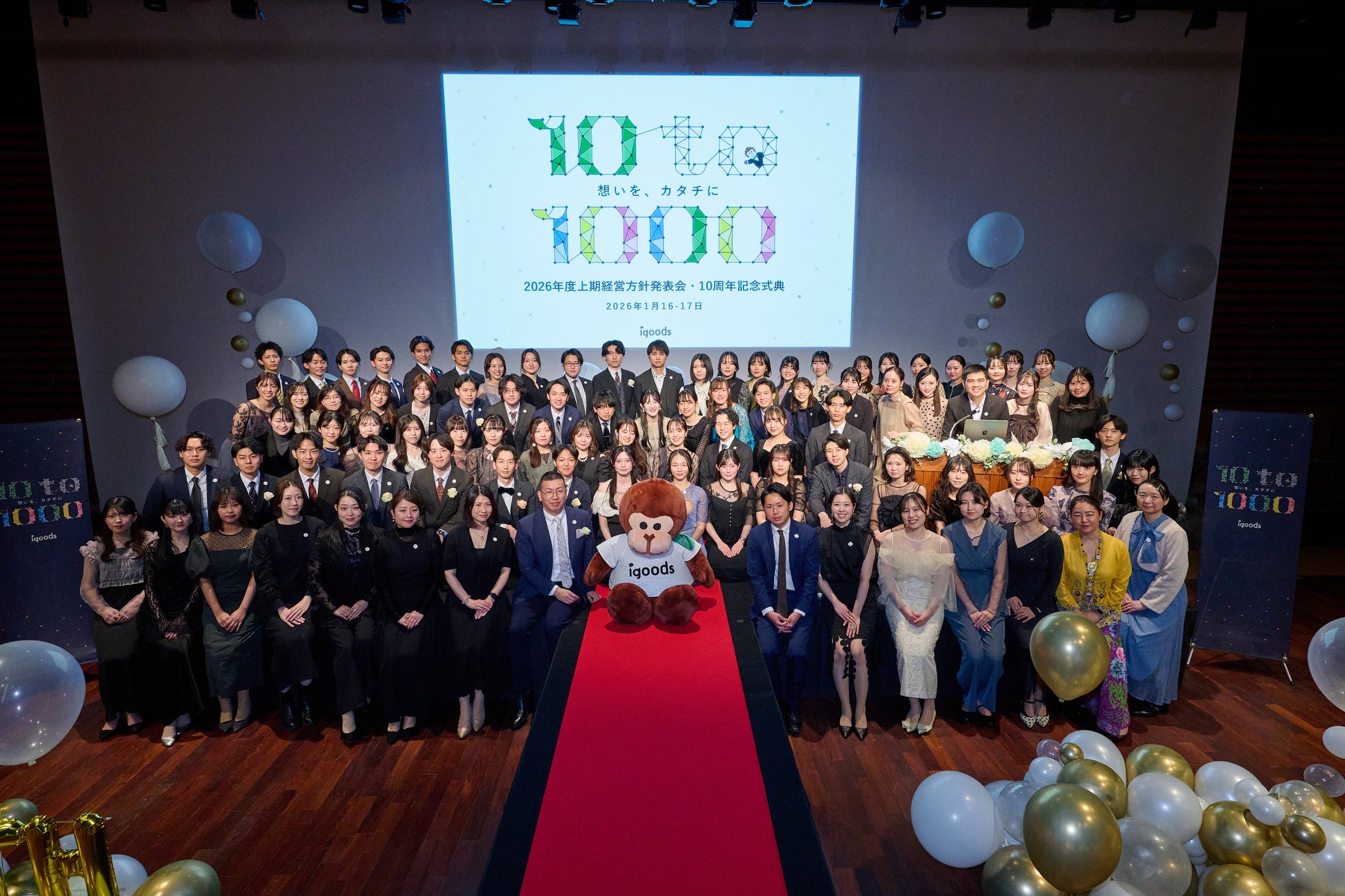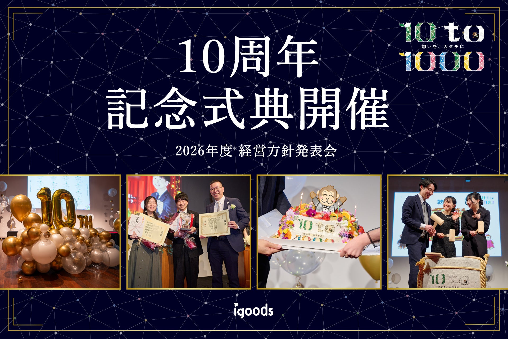 オリジナルグッズを企画製造するアイグッズ株式会社(本社:東京都渋谷区)は、2026年1月16日(金)・17日(土)に「10周年記念式典・2026年度 上期経営方針発表会」を開催しました。今回掲げたテーマは「10 to 1000(点と線)」。これまで積み重ねてきた歴史や想いを振り返り、未来に繋げるためのワークやコンテンツを通じて、新たな覚悟を醸成する2日間となりました。