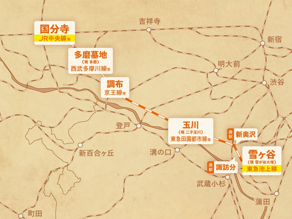 池上電気鉄道は、現在の東急池上線を開通させた電鉄です。池上線に続いて、雪ヶ谷(現:雪が谷大塚)から国分寺に向けて路線を計画しますが、ライバル企業によって行く手を阻まれてしまいます。実現していれば、鉄道のない多摩川の東側が鉄道で結ばれるほか、JR中央線沿線から東京・城南エリアへの短絡ルートとなっていたかもしれません。