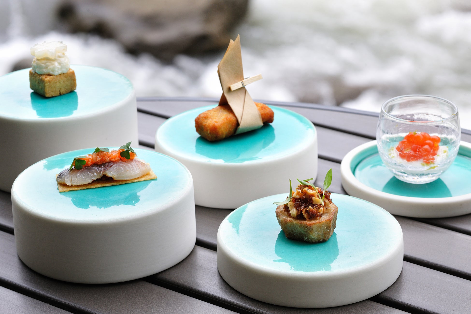 フレンチレストラン「Sonore」では、旬の食材をふんだんに使用したフランス料理や銘醸ワインを味わい、心身ともに癒される食体験を提供しています。渓流の瀬音や夕日に照らされて黄金色に輝く黄葉の景色に癒されながら、この場所でしか味わえない贅沢なアペリティフ(*1)を楽しめます。秋の時期には、脂が乗った鮪や鴨肉のほか、木の子や薩摩芋など豊富な秋の味覚を引き立てる独創的なペアリングを通じて、この場所ならではの特別な食体験を堪能できます。