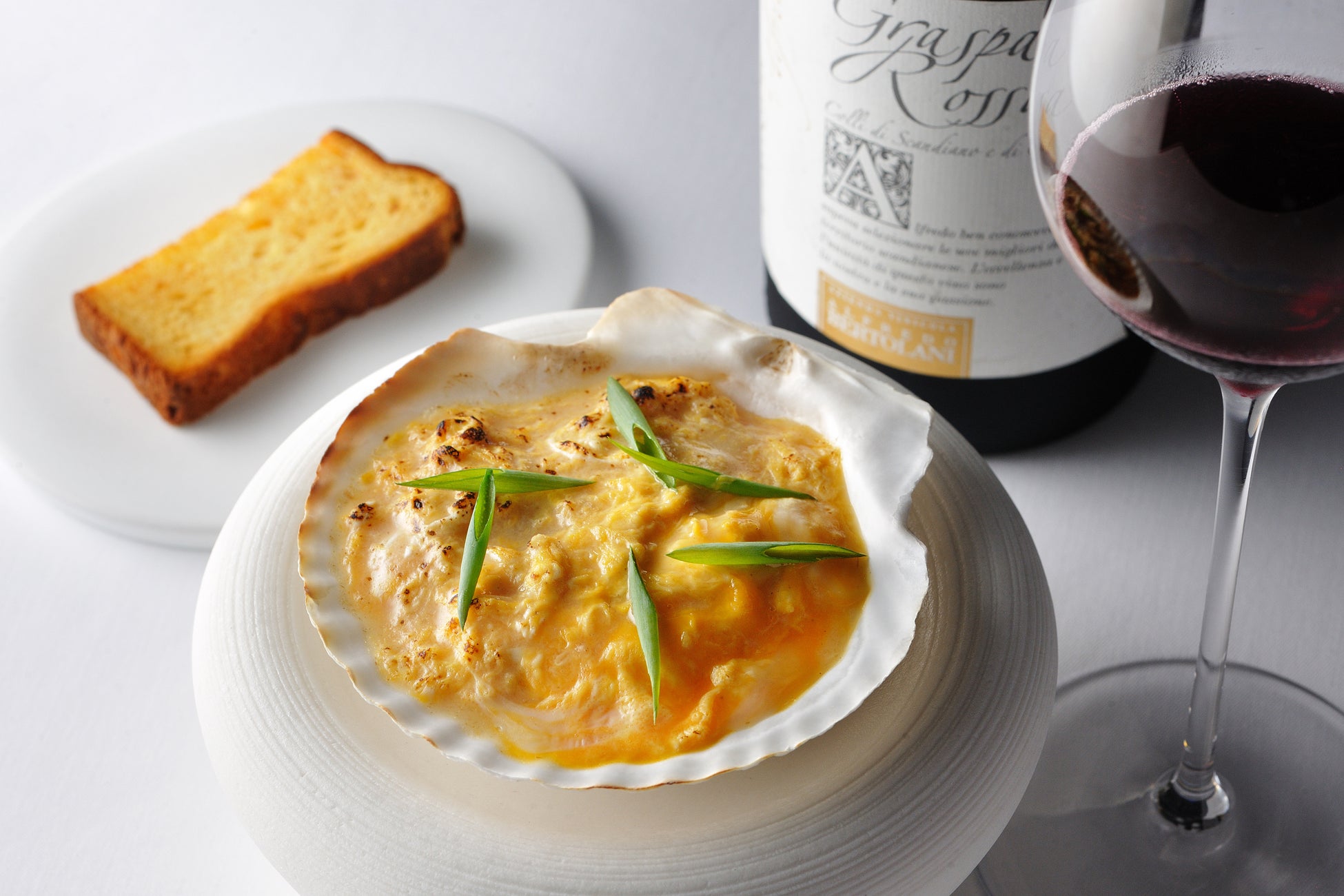 大きな貝殻を鍋のようにし、さまざまな具材を味噌と溶き卵で味わう青森県を代表する郷土料理です。帆立貝といりこ出汁の旨味をたっぷりと凝縮したソースと、それを包み込むようなとろとろとした食感の卵との相性は抜群です。味噌のブリオッシュと共に味わうことで、魚貝の旨味と味噌の風味が口の中に広がります。
