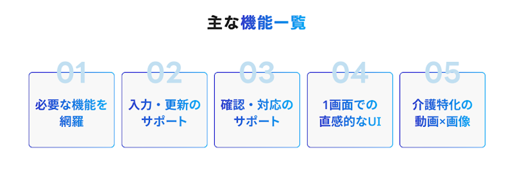 『carebase 』は、動画マニュアル × 記録管理 × 申し送り × 教育機能を統合した、介護現場特化型のクラウドシステムです。PC・タブレット・スマートフォンで直感的に操作でき、誰でも使いやすいUI/UXを追求しています。また、クラウド上で情報を一元管理することで、属人化の解消と業務の可視化を同時に実現します。