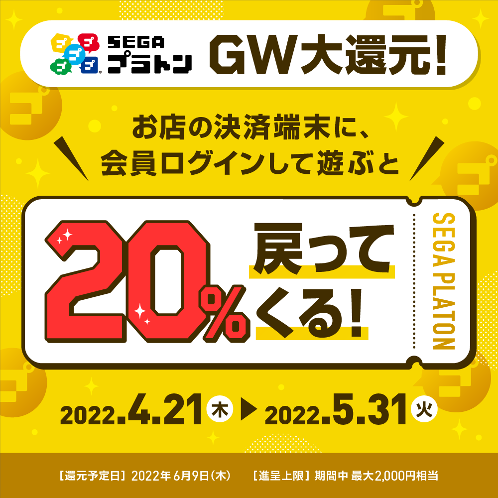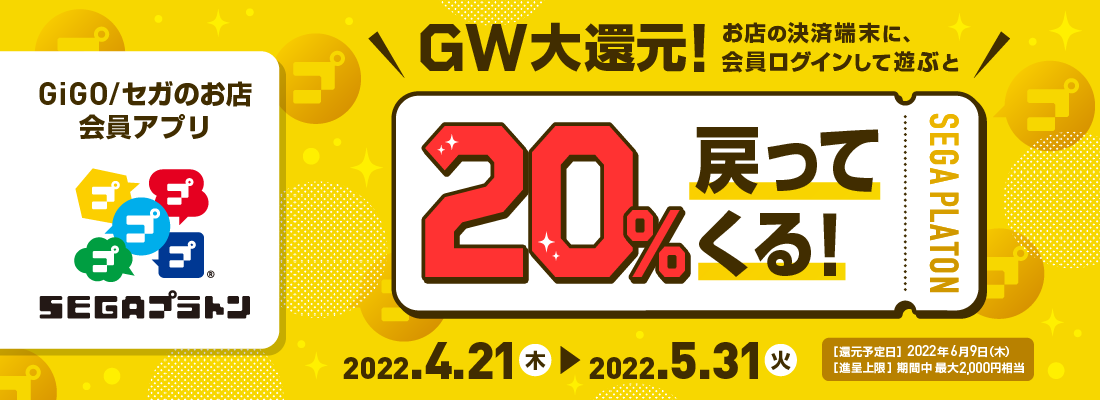 株式会社GENDA GiGO Entertainment(本社:東京都大田区 代表取締役社長:上野 聖)は、当社※が運営するアミューズメント施設の会員アプリ『SEGAプラトン』対象店舗において、期間中累計決済額の20%分のサービス券を後日還元するキャンペーン「GW大還元」を開催いたします。(期間:2022/4/21(木)~2022/5/31(火))
