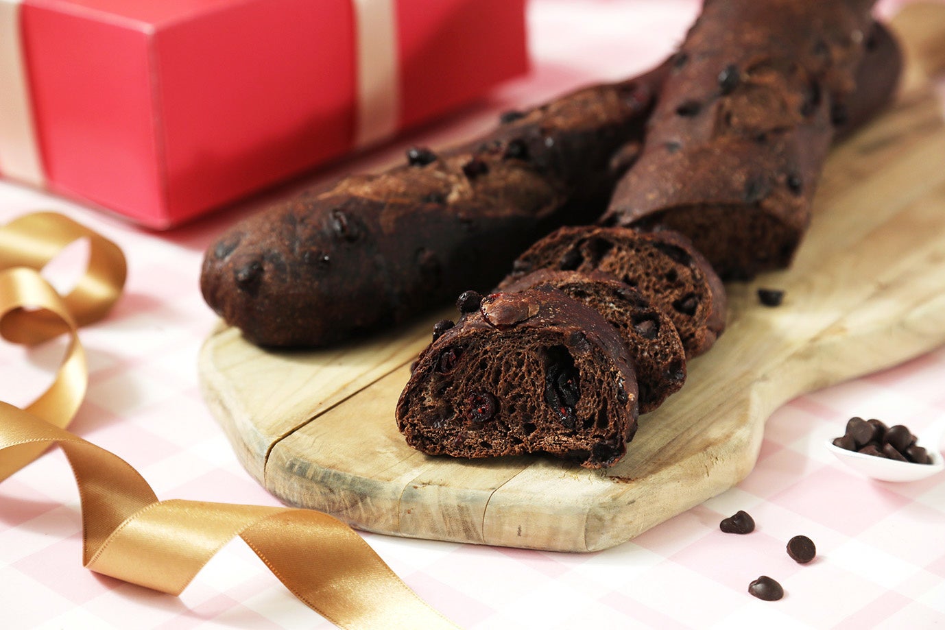 チョコを混ぜた生地に、チョコチップとクランベリーを練りこんで焼き上げました。甘いチョコチップと甘酸っぱいクランベリーが相性抜群!バレンタインシーズンの食卓で、ワインとのペアリングをお楽しみいただいたり、フルーツやクリームチーズをのせてカナッペとしてご賞味いただくのもおすすめです。