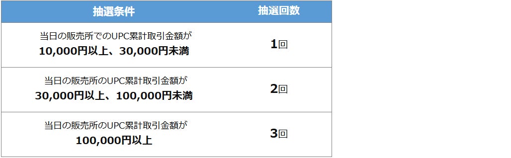 キャンペーン期間中、当日の【販売所でのUPC累計取引金額】に応じて抽選に参加できます(獲得した抽選回数は当日のみ抽選可能)。