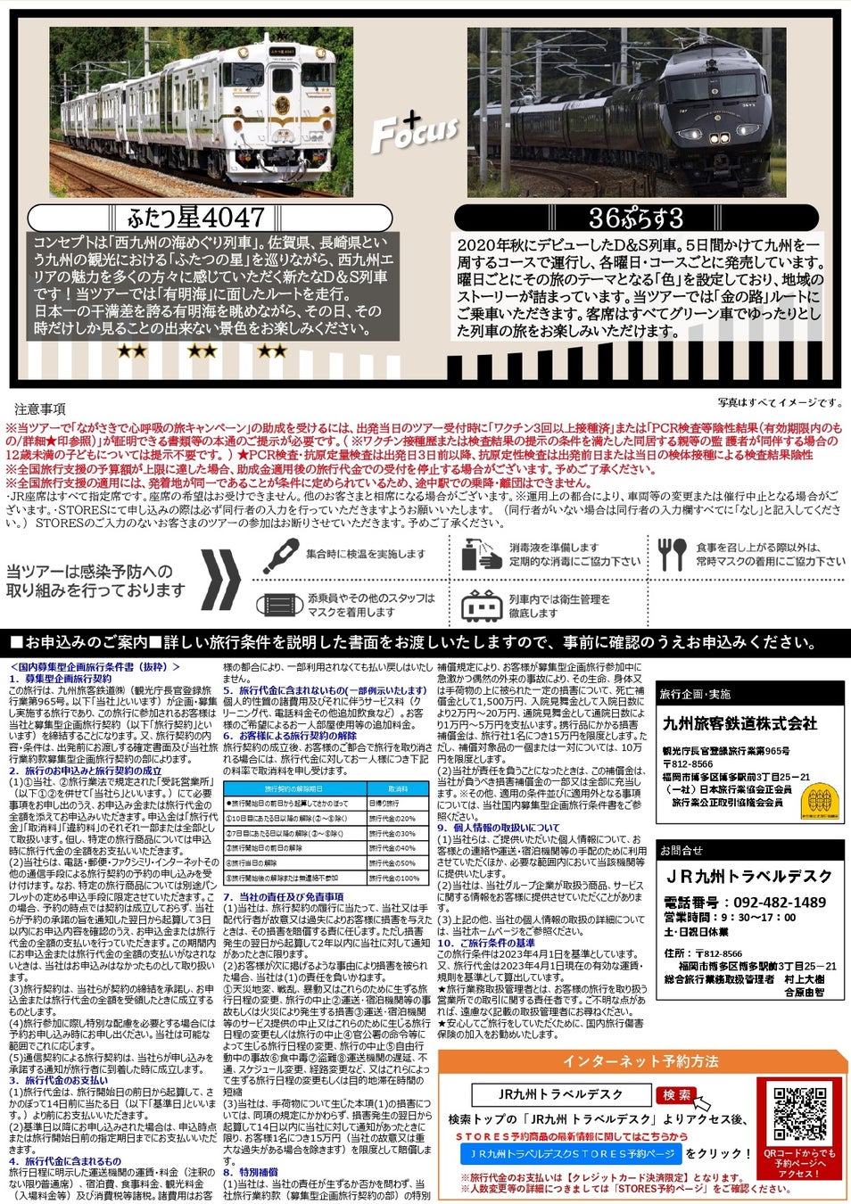 九州旅客鉄道株式会社(以下、JR九州)は、特急「ふたつ星4047」と特急「36ぷらす3」、西九州新幹線「かもめ」に1日で乗車できる日帰りツアーを発売中です。