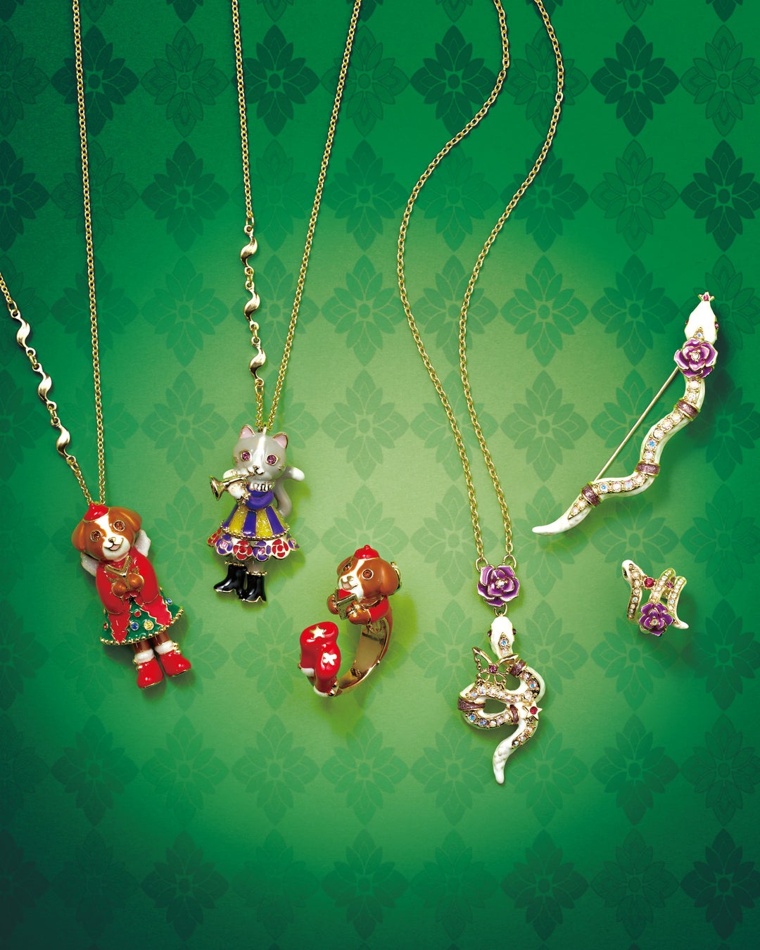 クリスマスツリー柄の真っ赤な服を着て楽しそうに歌う犬や、トランペットを演奏するハチワレ猫は薔薇模様のドレス姿がキュート。立体感のある可愛らしい姿と細部までこだわったディテールは、見ても着けても楽しめるコレクションです。