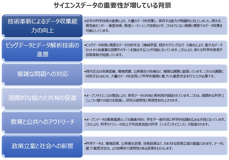 これらの要因が相まって、サイエンスデータは今日の研究、教育、政策立案、さらには一般社会においても非常に重要な役割を果たしています。