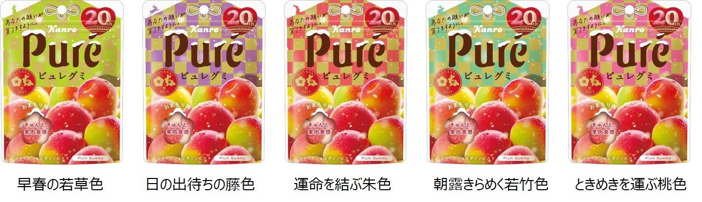 「ピュレグミおまもり梅」は、5種のお守り風パッケージで展開します。金色の格子柄が華やかさを演出し、さりげないうさぎのシルエットやロゴに積もった雪など細部までこだわった、季節感あふれるデザインに仕上げました。「あなたの願いが実りますように。」のメッセージを添え、それぞれ「運命を結ぶ朱色」「ときめきを運ぶ桃色」など、縁起の良いオリジナルの色名がつけられています。お気に入りのパッケージを選んで、お守り代わりに持ち歩いてください。