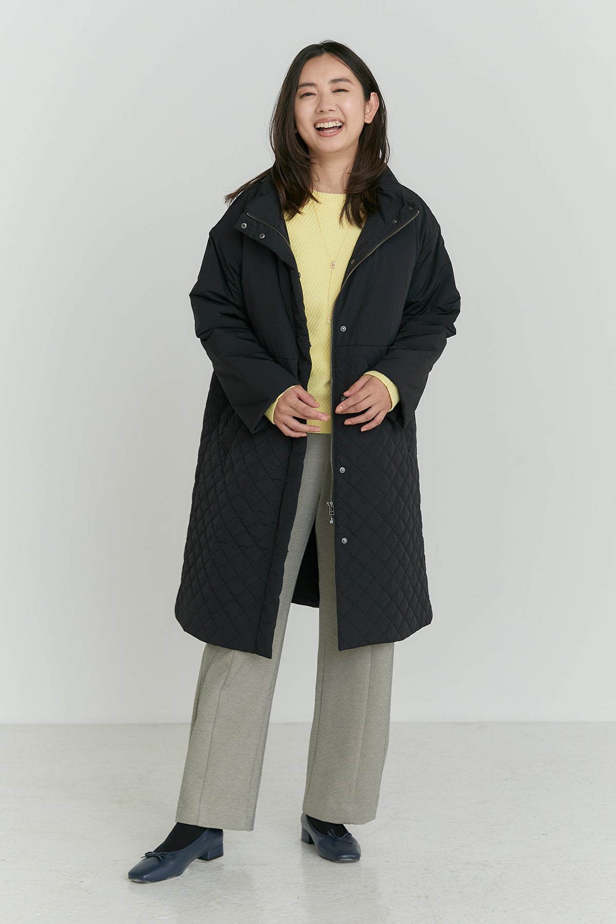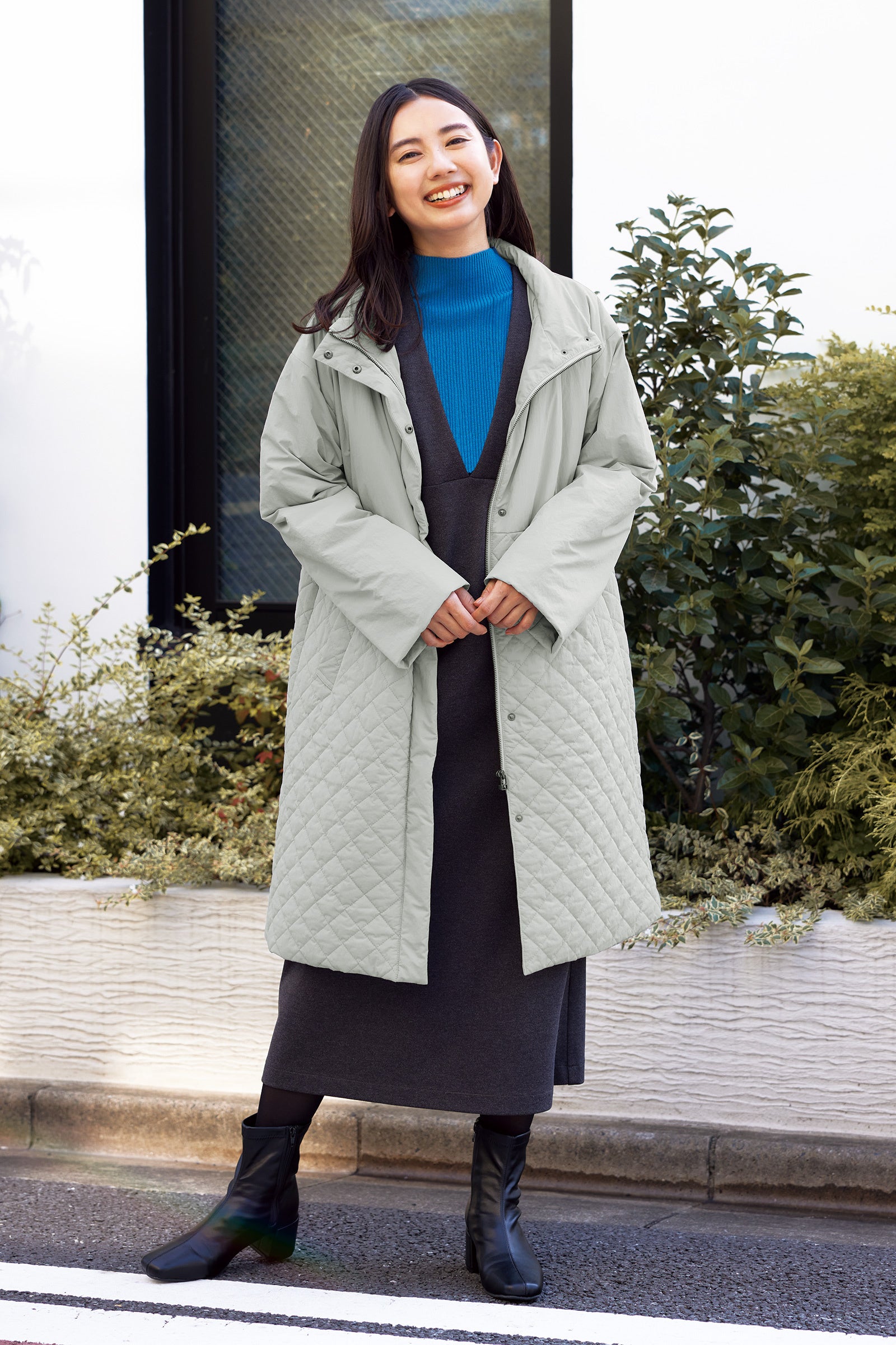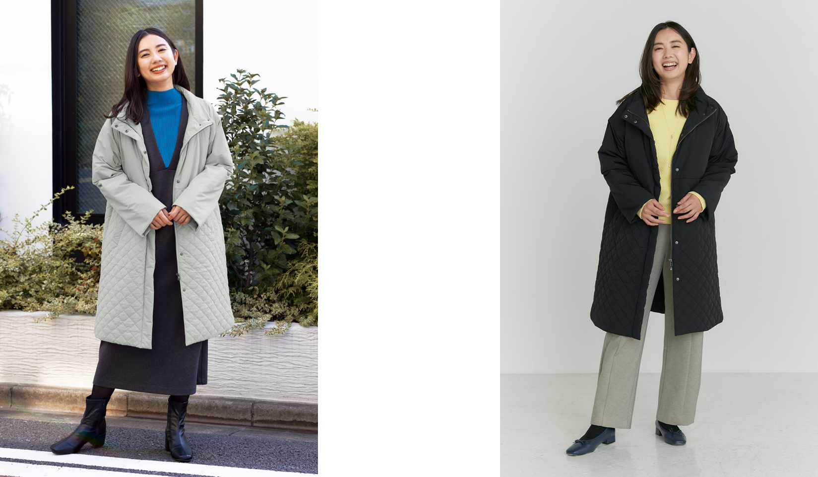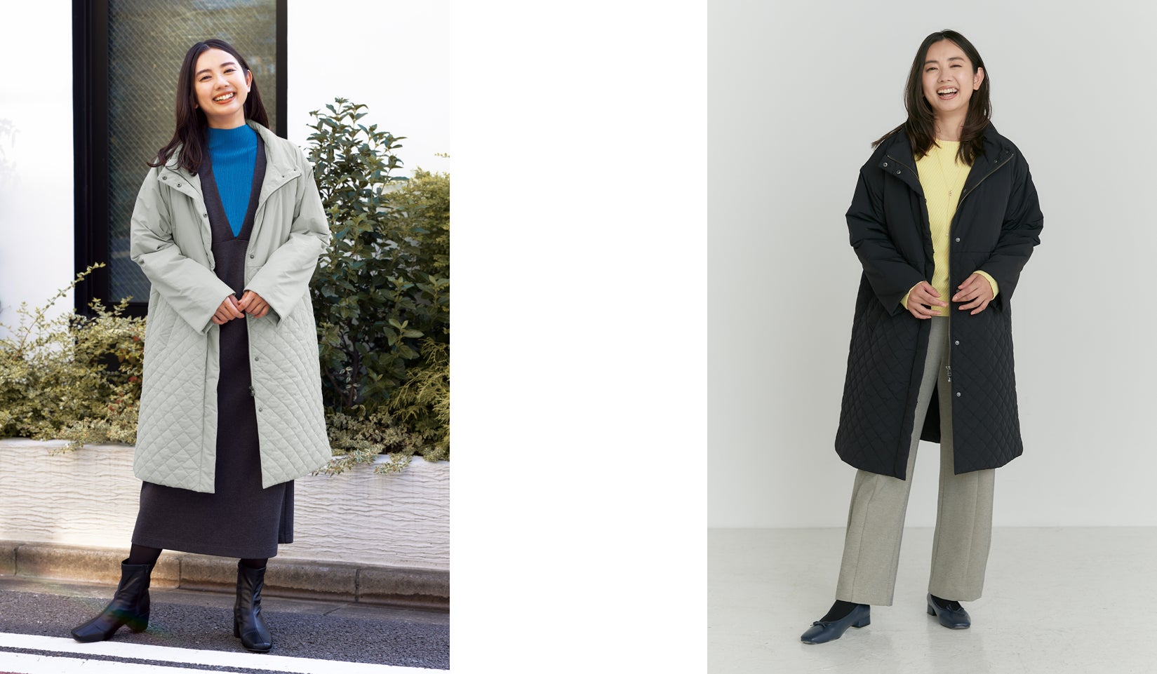 今回発売される「【すごナノ撥水】中綿キルトMIXコート」は、忙しい毎日にサラッと1枚であたたかく、シーンレスにお使いいただけるアイテムとなっております。着膨れしやすい中綿コートですが、軽くて薄く、かつあたたかい機能性中綿THERMOLITE® EcoMadeを使用しボリューム感を抑え、さらに腰部分に切り替えを入れることですっきりと脚長に見せるシルエットに。襟を立てればスタンドタイプで大人っぽく上品に決まります。