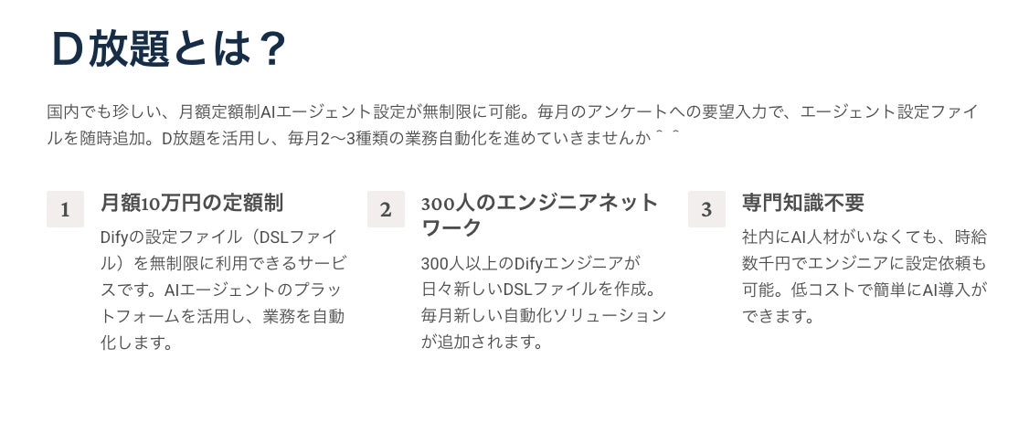 株式会社ライトアップ(証券コード 6580)は、2025年4月1日より、AIエージェントのプラットフォーム「Dify」を活用した業務自動化支援サービス「D放題」の提供を開始いたします。本サービスは、企業の業務をAIによって効率化するための設定ファイル(DSLファイル)を、月額10万円で無制限に利用できるサブスクリプション型のサービスです。