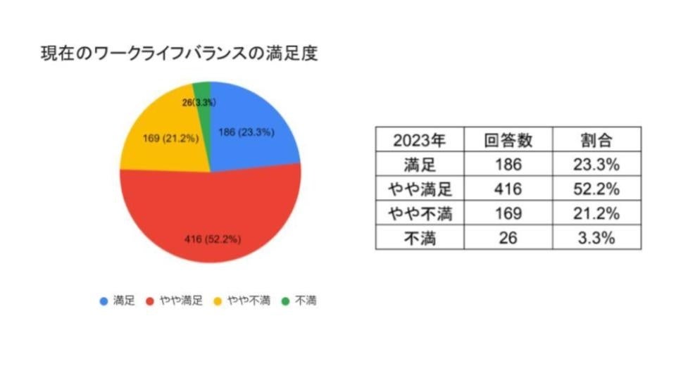 「現在のワークライフバランスに満足しているか」という質問に対して、「満足している」と回答した割合は全体の23.3%であり、「やや満足している」と答えた割合は全体の52.2%である。