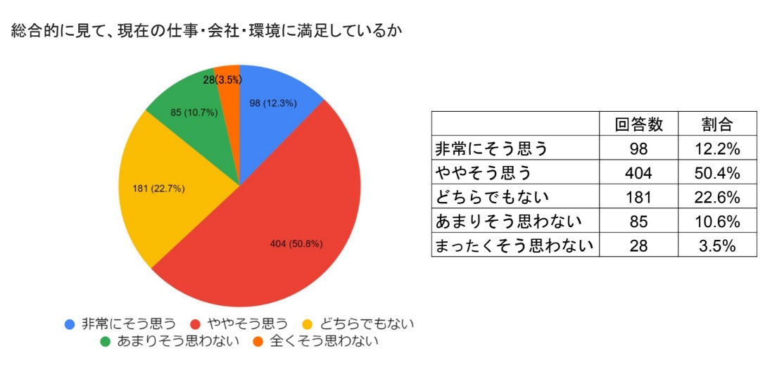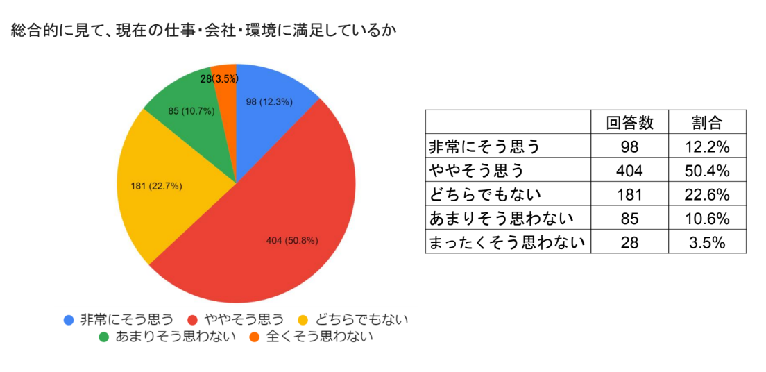 「総合的に見て、現在の仕事・会社・環境に満足しているか」という質問に対して「非常にそう思う」と回答したのは全体の12.2%、「ややそう思う」と回答したのは全体の50.4%、「どちらでもない」と回答したのは22.6%であった。数値としては高いが、アイエスエフネットは10のビジョン(※5)を目指しているため、この項目では従業員の声に耳を傾ける姿勢と改善が必要である。